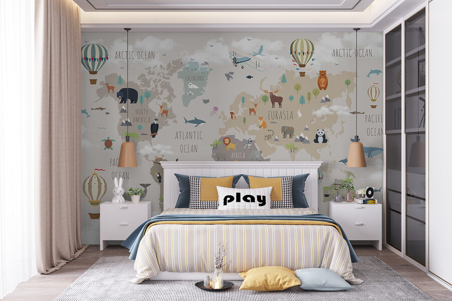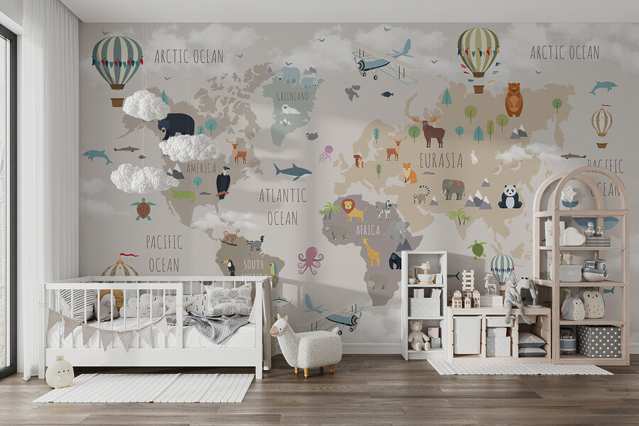 Αυτή η τοιχογραφία δεν είναι απλώς διακόσμηση – είναι μια ολόκληρη εμπειρία. Τα παιδιά μπορούν να μάθουν για διαφορετικές ηπείρους και ωκεανούς, ενώ παράλληλα εντοπίζουν τα αγαπημένα τους ζώα, από τις πολικές αρκούδες στη Γροιλανδία μέχρι τα καγκουρό στην Αυστραλία. Τα απαλά χρώματα είναι ηρεμιστικά, ιδανικά για παραμύθια πριν τον ύπνο ή για τεμπέλικα κυριακάτικα απογεύματα. Είναι το είδος της διακόσμησης που κεντρίζει τη φαντασία και την περιέργεια, καθιστώντας το ιδανικό για παιδικά δωμάτια, παιδότοπους ή ακόμη και για αίθουσες διδασκαλίας. Επιπλέον, η ανακάλυψη νέων λεπτομερειών κάθε μέρα διατηρεί τη μαγεία ζωντανή.