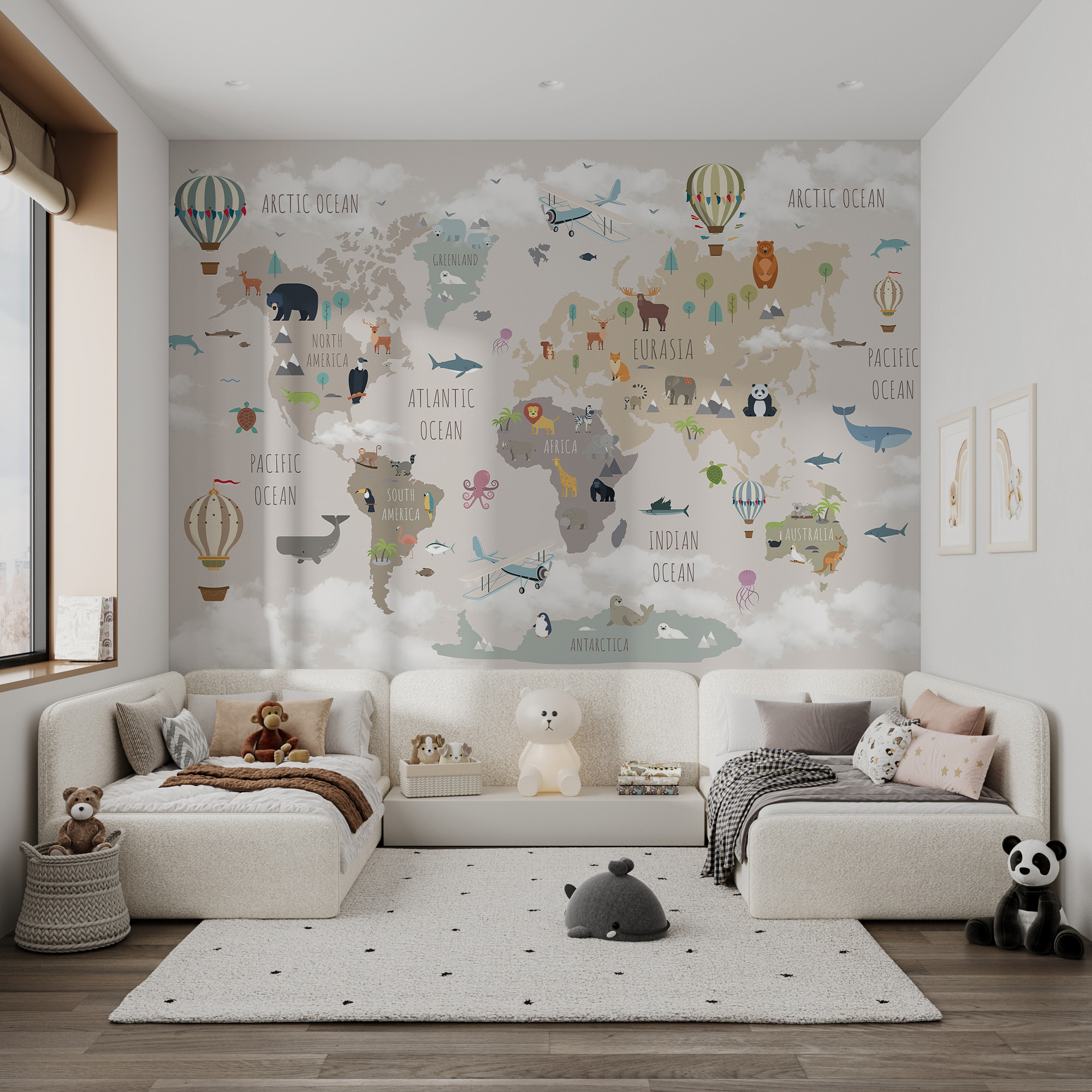 Αυτή η τοιχογραφία δεν είναι απλώς διακόσμηση – είναι μια ολόκληρη εμπειρία. Τα παιδιά μπορούν να μάθουν για διαφορετικές ηπείρους και ωκεανούς, ενώ παράλληλα εντοπίζουν τα αγαπημένα τους ζώα, από τις πολικές αρκούδες στη Γροιλανδία μέχρι τα καγκουρό στην Αυστραλία. Τα απαλά χρώματα είναι ηρεμιστικά, ιδανικά για παραμύθια πριν τον ύπνο ή για τεμπέλικα κυριακάτικα απογεύματα. Είναι το είδος της διακόσμησης που κεντρίζει τη φαντασία και την περιέργεια, καθιστώντας το ιδανικό για παιδικά δωμάτια, παιδότοπους ή ακόμη και για αίθουσες διδασκαλίας. Επιπλέον, η ανακάλυψη νέων λεπτομερειών κάθε μέρα διατηρεί τη μαγεία ζωντανή.