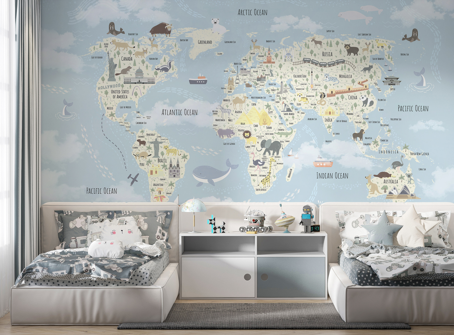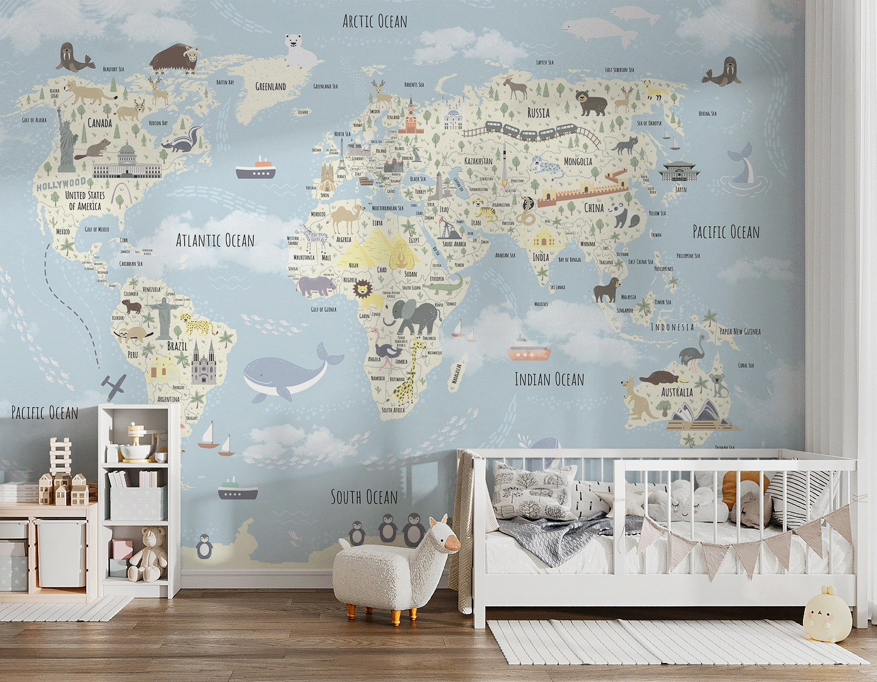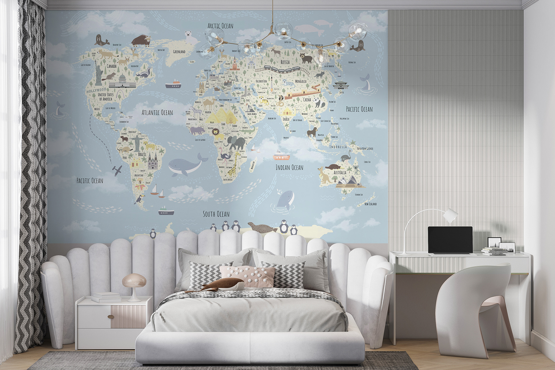 Φανταστείτε αυτή την τοιχογραφία του παγκόσμιου χάρτη στο δωμάτιο του παιδιού σας – είναι σαν να του δίνετε το σύμπαν να εξερευνήσει χωρίς να φύγει από το σπίτι. Κάθε φορά που την κοιτάζουν, θα ταξιδεύουν από την Αλάσκα μέχρι την Αυστραλία. Χαριτωμένη και λεπτομερής, είναι γεμάτη με ζώα, ορόσημα και ωραία κομμάτια που κεντρίζουν την περιέργεια. Οι απαλές παστέλ αποχρώσεις το κάνουν απαλό για τα μάτια, προσθέτοντας μια παιχνιδιάρικη αλλά και ηρεμιστική ατμόσφαιρα. Ιδανικό για τα μικρά παιδιά, είτε είναι λάτρεις της γεωγραφίας είτε απλά ονειροπόλοι. Απλά δείτε τα να φωτίζονται καθώς εντοπίζουν ένα νέο ζώο ή μια νέα χώρα – ταξιδεύοντας τον κόσμο από τον άνετο χώρο τους! Ιδανικό και για παραμύθια – φανταστείτε τις περιπέτειες που θα φανταστούν. Επιπλέον, είναι αρκετά όμορφο ώστε να αποτελεί από μόνο του έργο τέχνης! Πόσο διασκεδαστικό είναι αυτό;