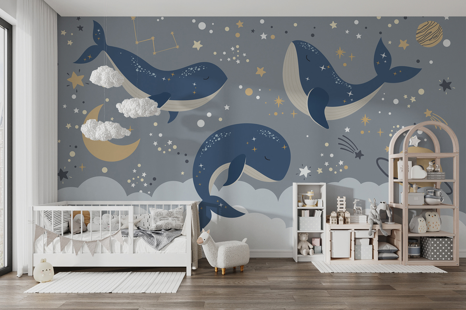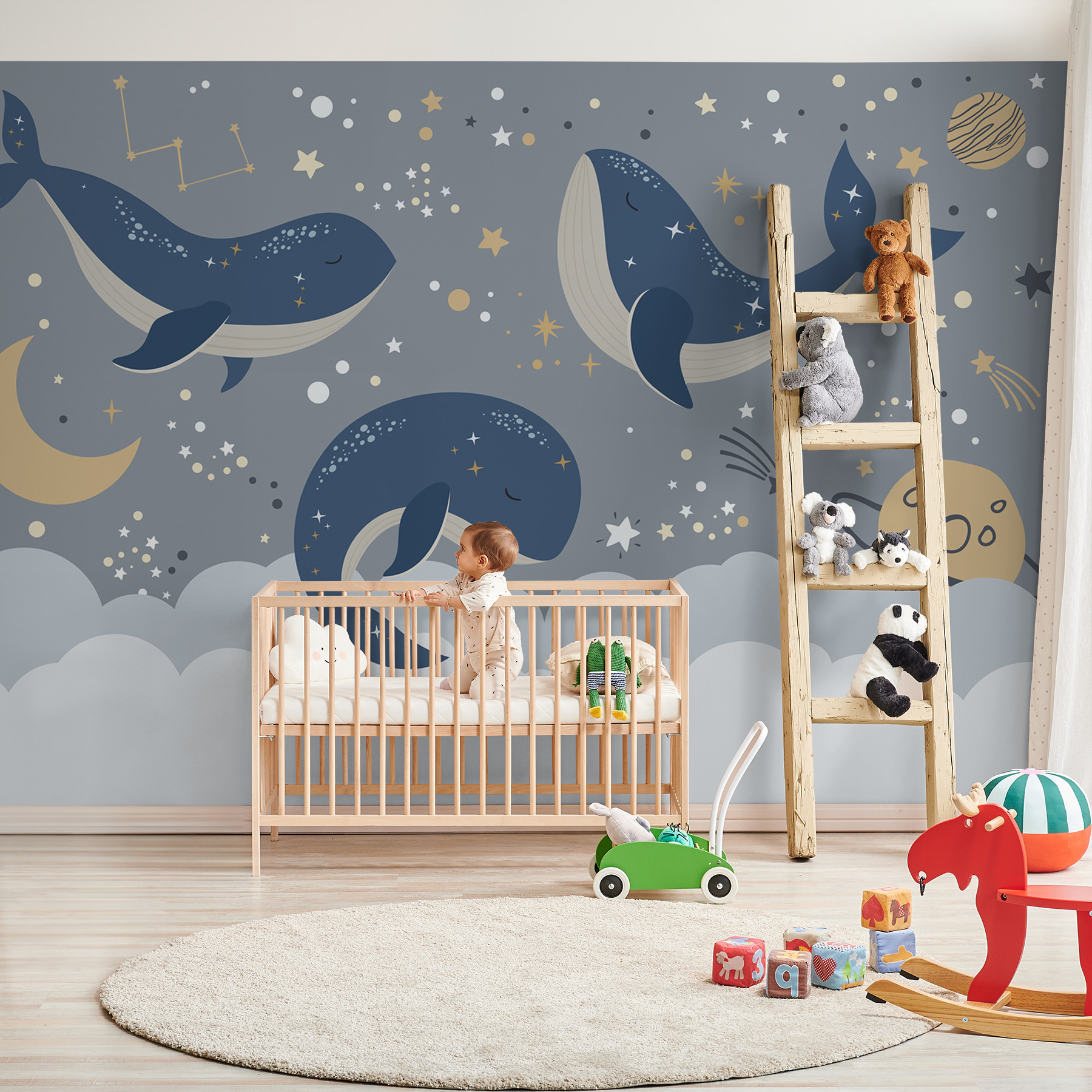 Θέλετε να προσθέσετε μια πινελιά θαύματος στο δωμάτιο του παιδιού σας; Δείτε αυτό το ονειρικό “Ταπετσαρίες Blue Whale with White Tail and Stars!” (Τοιχογραφίες μπλε φάλαινα με λευκή ουρά και αστέρια). Φανταστείτε το στον τοίχο του παιδιού σας – είναι σαν το δικό του κομμάτι του νυχτερινού ουρανού, με χαριτωμένες μπλε φάλαινες που επιπλέουν απαλά μέσα σε μια θάλασσα από αστέρια και αστερισμούς. Ιδανικό για παιδικά δωμάτια ή για το χώρο κάθε μικρού τυχοδιώκτη, προσθέτει ακριβώς τη σωστή πινελιά μαγείας και γαλήνης. Επιπλέον, αυτές οι νυσταγμένες φάλαινες φαίνεται να υπόσχονται γλυκά όνειρα για όποιον κοιμηθεί από κάτω τους. Είναι παράξενο, ηρεμιστικό και λίγο παιχνιδιάρικο – ένα ευχάριστο σκηνικό για παραμύθια και απογευματινούς ύπνους. Είτε πρόκειται για τον γιο σας, την κόρη σας, είτε για εκείνες τις στιγμές αγκαλιάς με το μωρό σας, μεταμορφώνει κάθε τοίχο σε μια καταπραϋντική, αστροφωτισμένη περιπέτεια.
