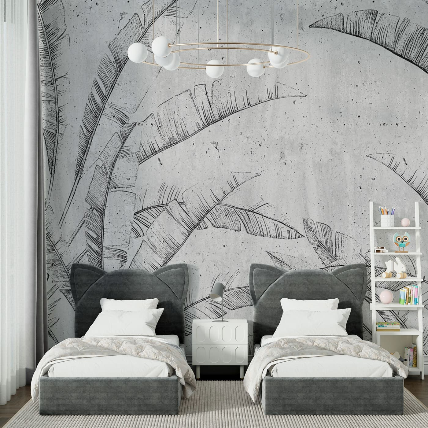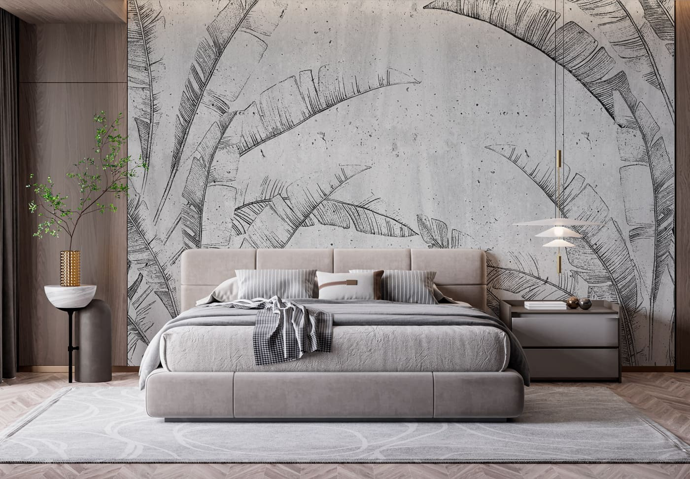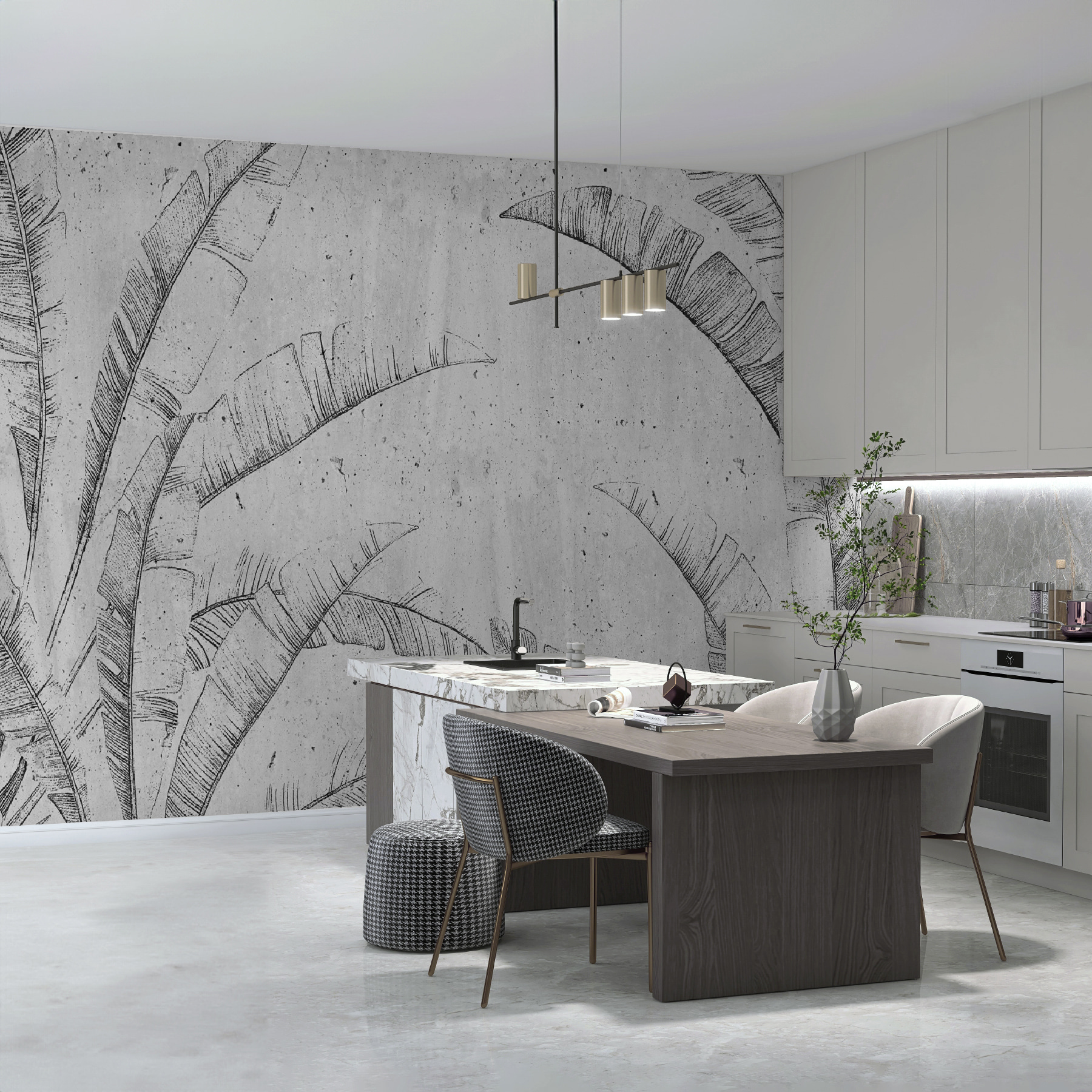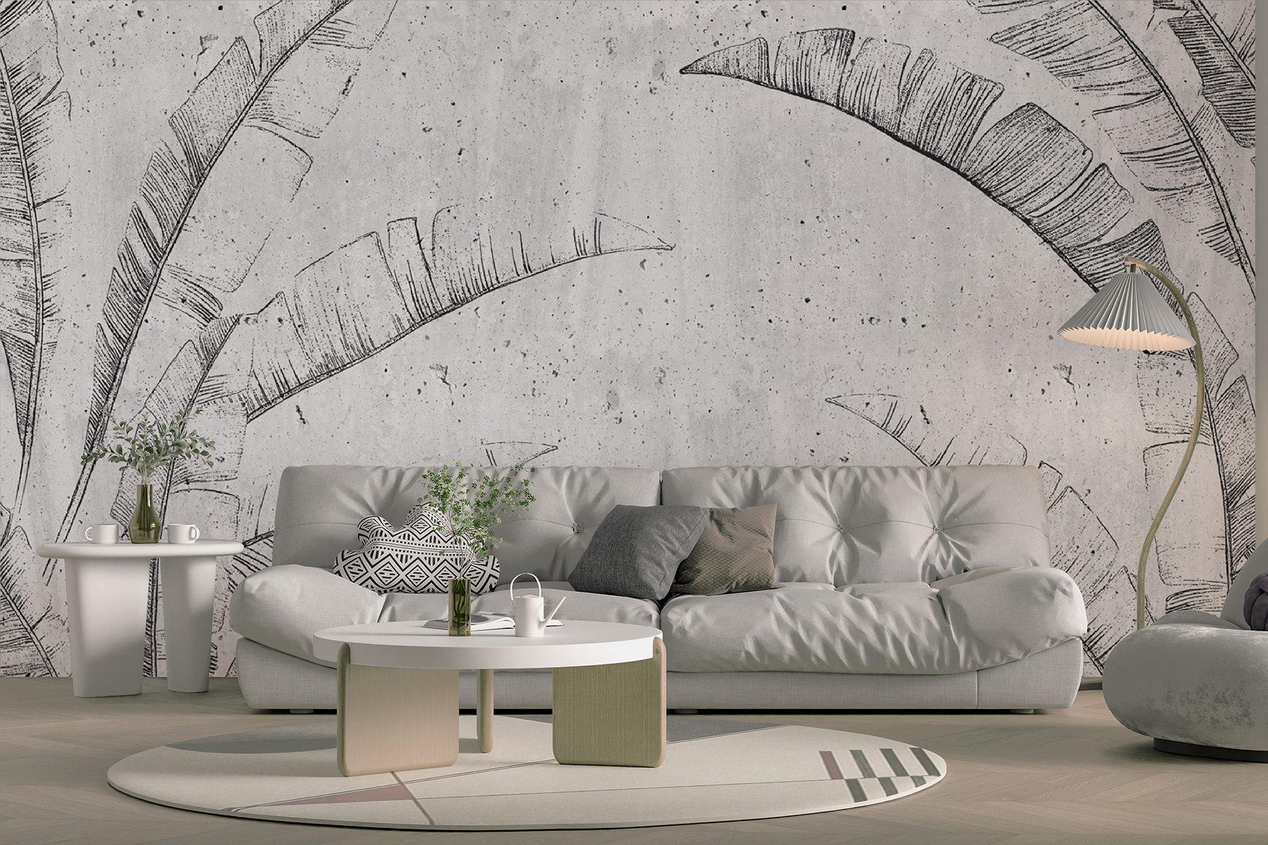 Φανταστείτε αυτό στον τοίχο σας – “Μοτίβο τροπικών φύλλων στο σκυρόδεμα”. Μια τοιχογραφία που φωνάζει τόσο αστικό σικ όσο και μια μικροσκοπική όαση ζούγκλας. Είναι ιδανικό αν θέλετε να κάνετε έναν χώρο να αισθάνεται αεράτος αλλά και προσγειωμένος. Φανταστείτε να πίνετε τον πρωινό σας καφέ, να πιάνετε το παιχνίδι του φωτός πάνω σε αυτές τις γραμμές των φύλλων φοίνικα και να νιώθετε αυτή τη δροσερή, τσιμεντένια ατμόσφαιρα. Είναι σαν μια μικρή εξωτική απόδραση, αλλά χωρίς να χρειάζεστε αεροπορικό εισιτήριο. Σχεδόν περιμένετε να ακούσετε τα τροπικά πουλιά, σωστά; Αυτή η τοιχογραφία είναι ένα χαλαρό head-turner, ιδανικό για όποιον λατρεύει αυτό το μείγμα φύσης και μοντέρνου στυλ.