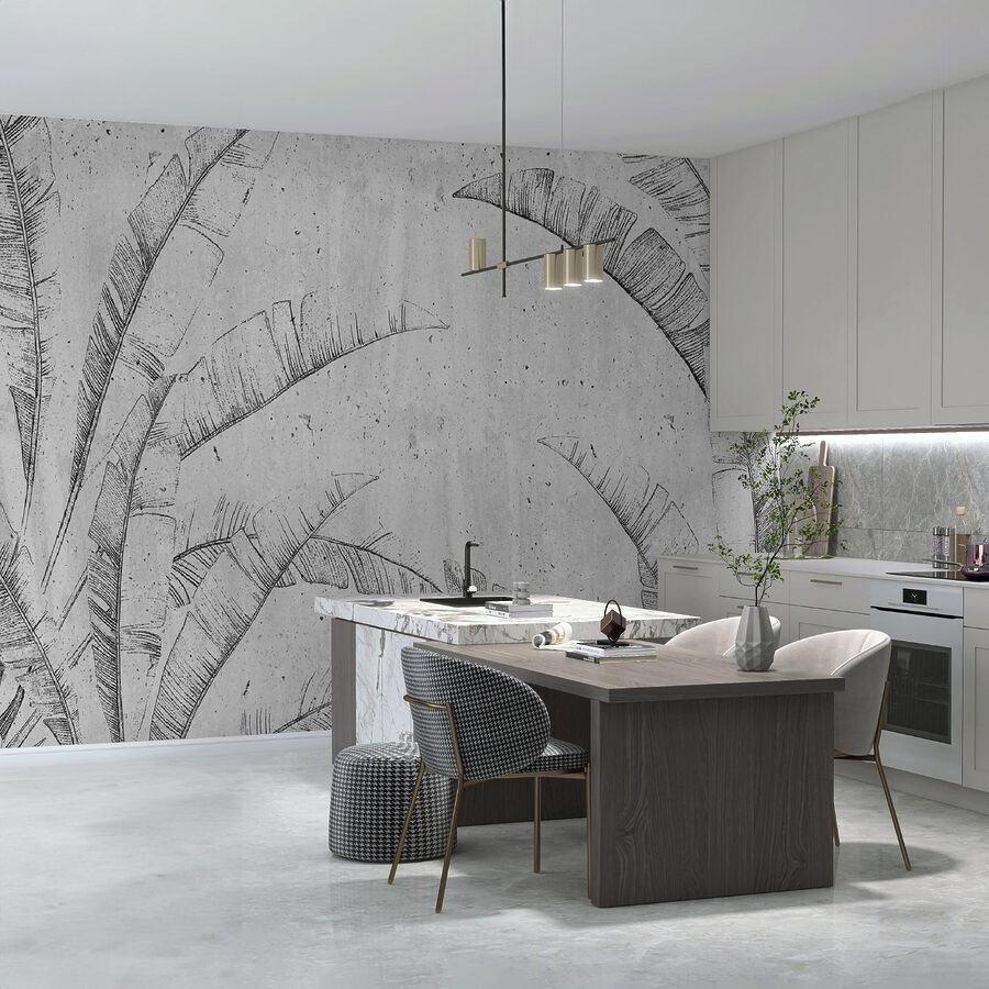 Φανταστείτε αυτό στον τοίχο σας – “Μοτίβο τροπικών φύλλων στο σκυρόδεμα”. Μια τοιχογραφία που φωνάζει τόσο αστικό σικ όσο και μια μικροσκοπική όαση ζούγκλας. Είναι ιδανικό αν θέλετε να κάνετε έναν χώρο να αισθάνεται αεράτος αλλά και προσγειωμένος. Φανταστείτε να πίνετε τον πρωινό σας καφέ, να πιάνετε το παιχνίδι του φωτός πάνω σε αυτές τις γραμμές των φύλλων φοίνικα και να νιώθετε αυτή τη δροσερή, τσιμεντένια ατμόσφαιρα. Είναι σαν μια μικρή εξωτική απόδραση, αλλά χωρίς να χρειάζεστε αεροπορικό εισιτήριο. Σχεδόν περιμένετε να ακούσετε τα τροπικά πουλιά, σωστά; Αυτή η τοιχογραφία είναι ένα χαλαρό head-turner, ιδανικό για όποιον λατρεύει αυτό το μείγμα φύσης και μοντέρνου στυλ.