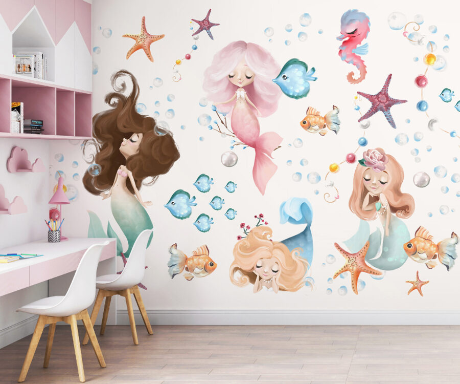 Φανταστείτε αυτό: μια απολαυστική τοιχογραφία που ξεχειλίζει από αλλόκοτη γοητεία. Ένα κορίτσι καρτούν με υπέροχα μακριά καστανά μαλλιά επιπλέει ειρηνικά ανάμεσα σε έναν ονειρικό υποβρύχιο κόσμο. Απαλές παστέλ αποχρώσεις και παιχνιδιάρικοι θαλάσσιοι φίλοι – σκεφτείτε χαρούμενα ψάρια και χαριτωμένους αστερίες – στροβιλίζονται γύρω της σε έναν μαγικό χορό. Είτε πρόκειται για το δωμάτιο του μικρού σας είτε για έναν χώρο που χρειάζεται μια πρέζα χαράς, αυτή η τοιχογραφία μεταμορφώνει τους απλούς τοίχους σε μια μαγευτική σκηνή παραμυθιού. Είναι σαν να φέρνετε ένα κομμάτι από τη χώρα της φαντασίας στην πόρτα σας – απλά δείτε τα ματάκια σας να φωτίζονται! 🌊✨