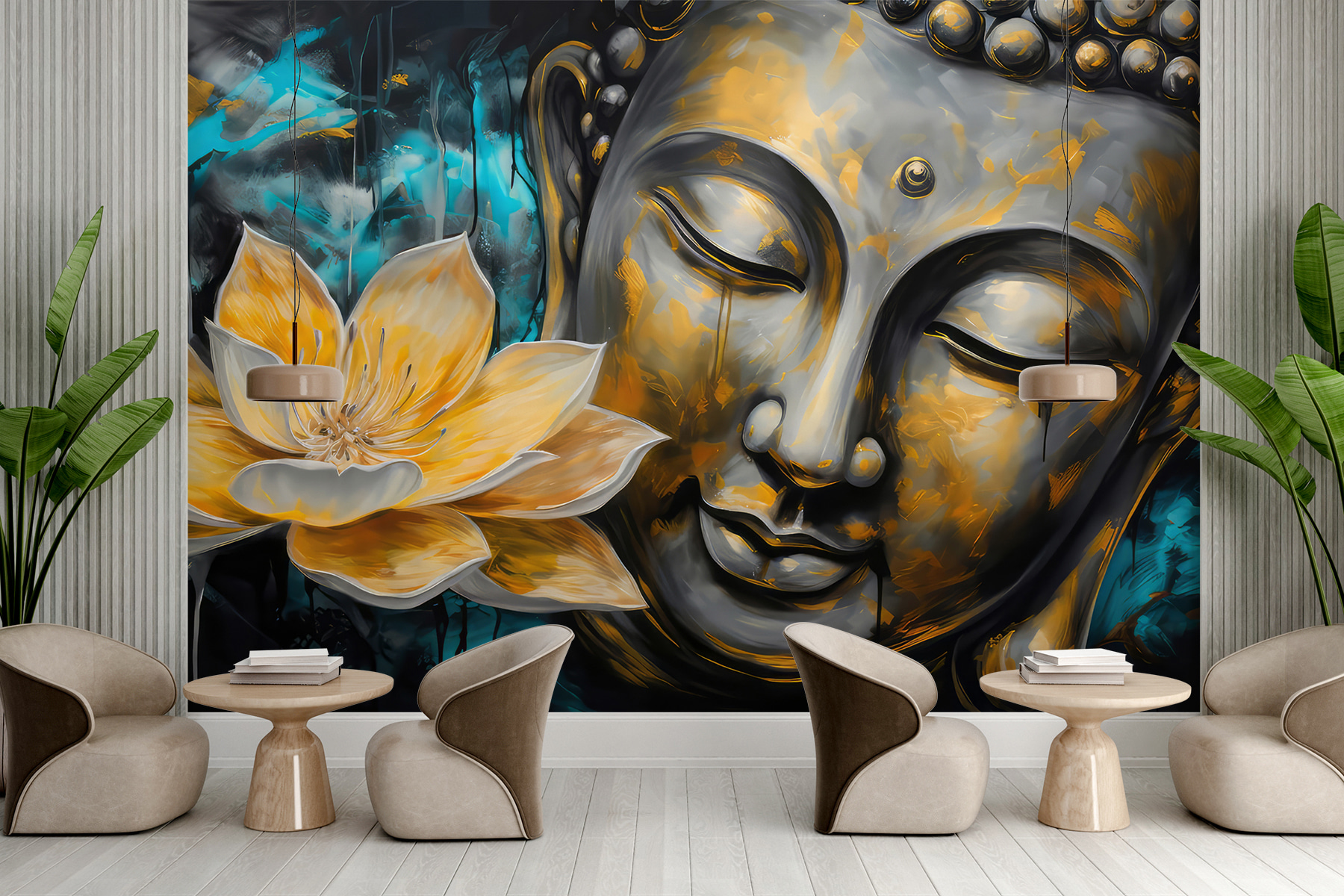 Φανταστείτε να μπαίνετε στο δωμάτιό σας και να σας υποδέχεται αυτή η μεγαλοπρεπής τοιχογραφία κάθε μέρα. Η “Τοιχογραφία ζωγραφικής ενός κίτρινου λουλουδιού” δεν είναι μόνο ένα κομμάτι για τα τοπία της πόλης, αλλά για τη μετατροπή ενός κανονικού τοίχου σε έναν εμπνευσμένο καμβά. Τα ζωηρά κίτρινα πέταλα φαίνεται να λάμπουν σε ένα μαγευτικό φόντο, προσφέροντας ένα ποπ χρώμα και μια δόση γαλήνης. Υπάρχει κάτι μαγικό στον τρόπο με τον οποίο το λουλούδι και το γαλήνιο πρόσωπο ρέουν μαζί – σχεδόν σαν να σας προσκαλούν να πάρετε μια βαθιά ανάσα και να χαλαρώσετε.