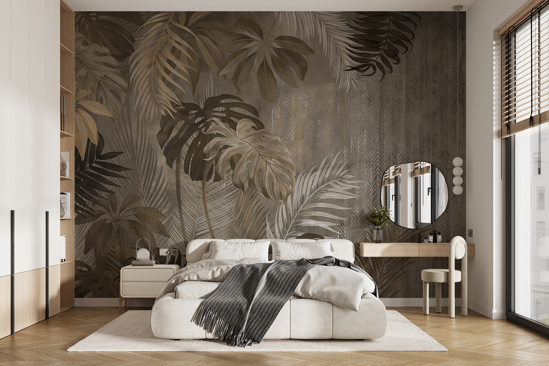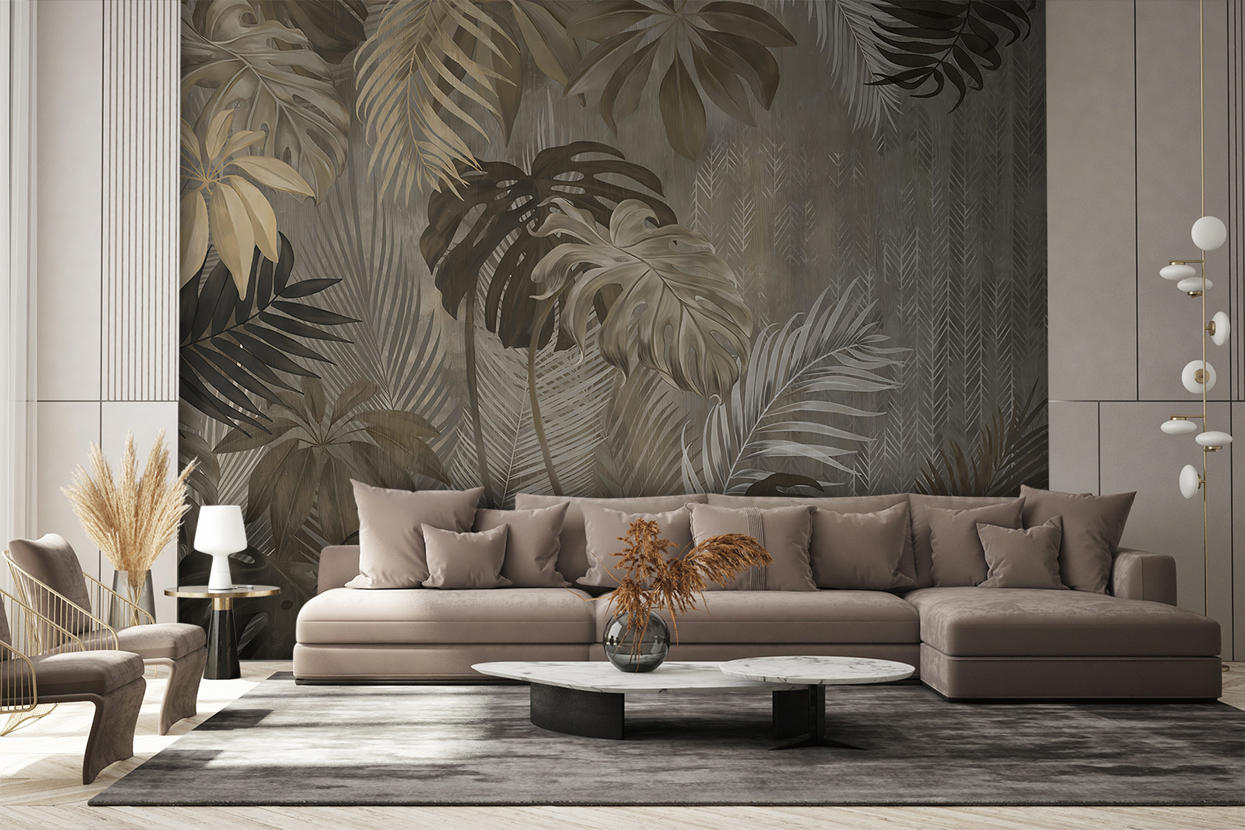 Μεταμορφώστε έναν βαρετό τοίχο σε τροπικό παράδεισο με αυτή την τοιχογραφία από κομψά φύλλα σε ένα όμορφα διαφοροποιημένο φόντο. Φανταστείτε να μπαίνετε σε ένα άνετο δωμάτιο και να αισθάνεστε σαν να έχετε περιπλανηθεί κατευθείαν σε μια καταπράσινη ζούγκλα – χωρίς τα κουνούπια, φυσικά. Οι γήινοι τόνοι εκπέμπουν μια ήρεμη ατμόσφαιρα, τυλίγοντάς σας σε μια ζεστή αγκαλιά. Ιδανικό για όσους λαχταρούν τη φύση αλλά ζουν μακριά από αυτήν. Οι φίλοι μπορεί να σας ρωτήσουν αν έχετε πάει διακοπές σε τροπικό δάσος! Είναι κάτι περισσότερο από τέχνη- είναι μια καθημερινή απόδραση, ένας τρόπος να προσκαλέσετε λίγο από την ύπαιθρο χωρίς να φύγετε από το σπίτι.