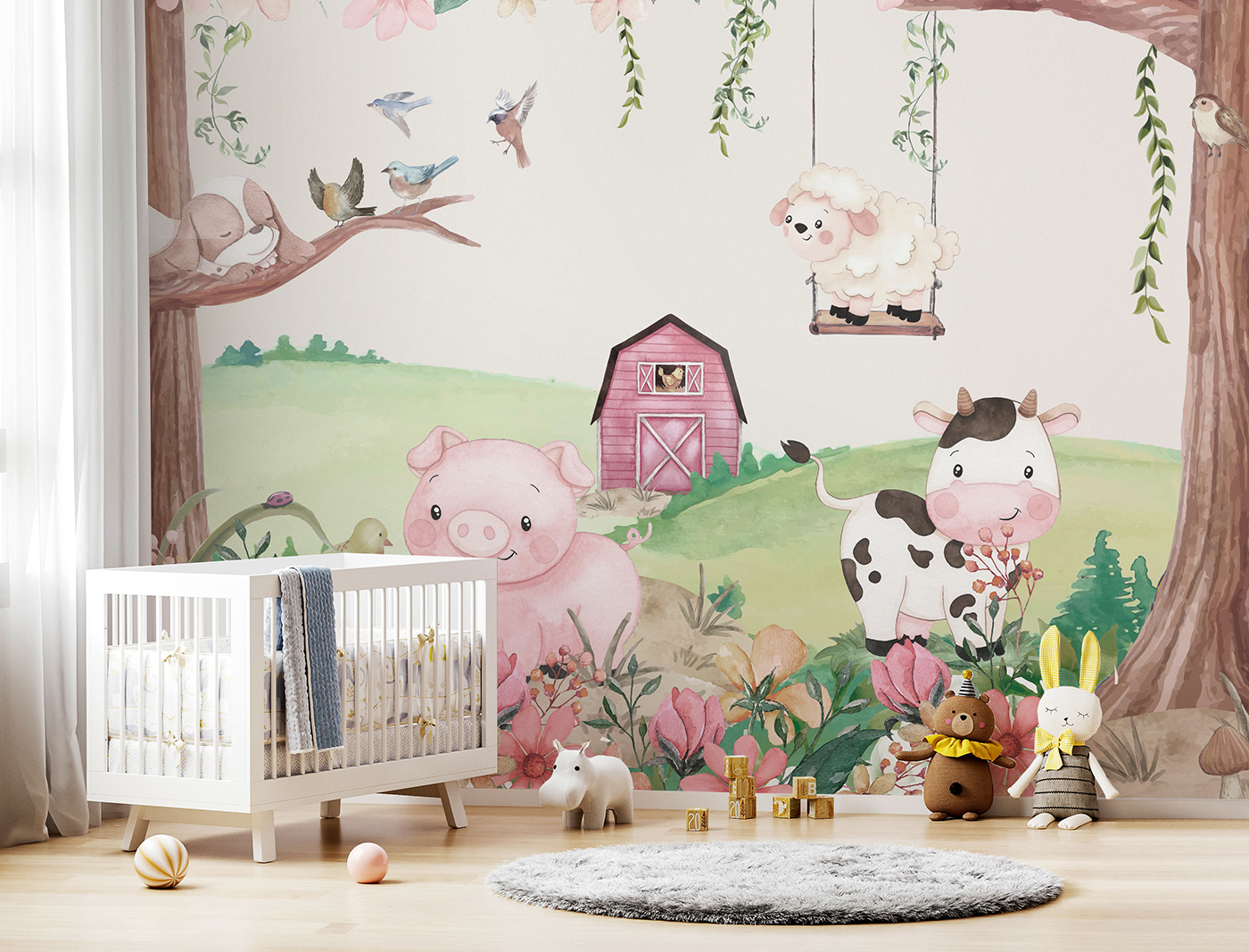 Τα απαλά χρώματα και οι παιχνιδιάρικες εικονογραφήσεις το καθιστούν εξαιρετικά φιλόξενο. Μπορείτε να φανταστείτε μια ζεστή γωνιά ανάγνωσης ή μια περιοχή παιχνιδιού με αυτό στον τοίχο; Είναι σαν το τέλειο σκηνικό για κάθε είδους περιπέτεια – ίσως ακόμη και για ένα παιχνιδιάρικο κουκλοθέατρο με τα ζώα ως κοινό! Και αυτές οι μικρές λεπτομέρειες, όπως το χαμογελαστό γουρούνι και η χαρούμενη αγελάδα, εγγυώνται ότι θα προκαλέσουν χαμόγελα. Επιπλέον, έχει κάτι τόσο καταπραϋντικό – μια ευγενική υπενθύμιση απλούστερων εποχών και παιχνιδιάρικων ημερών.