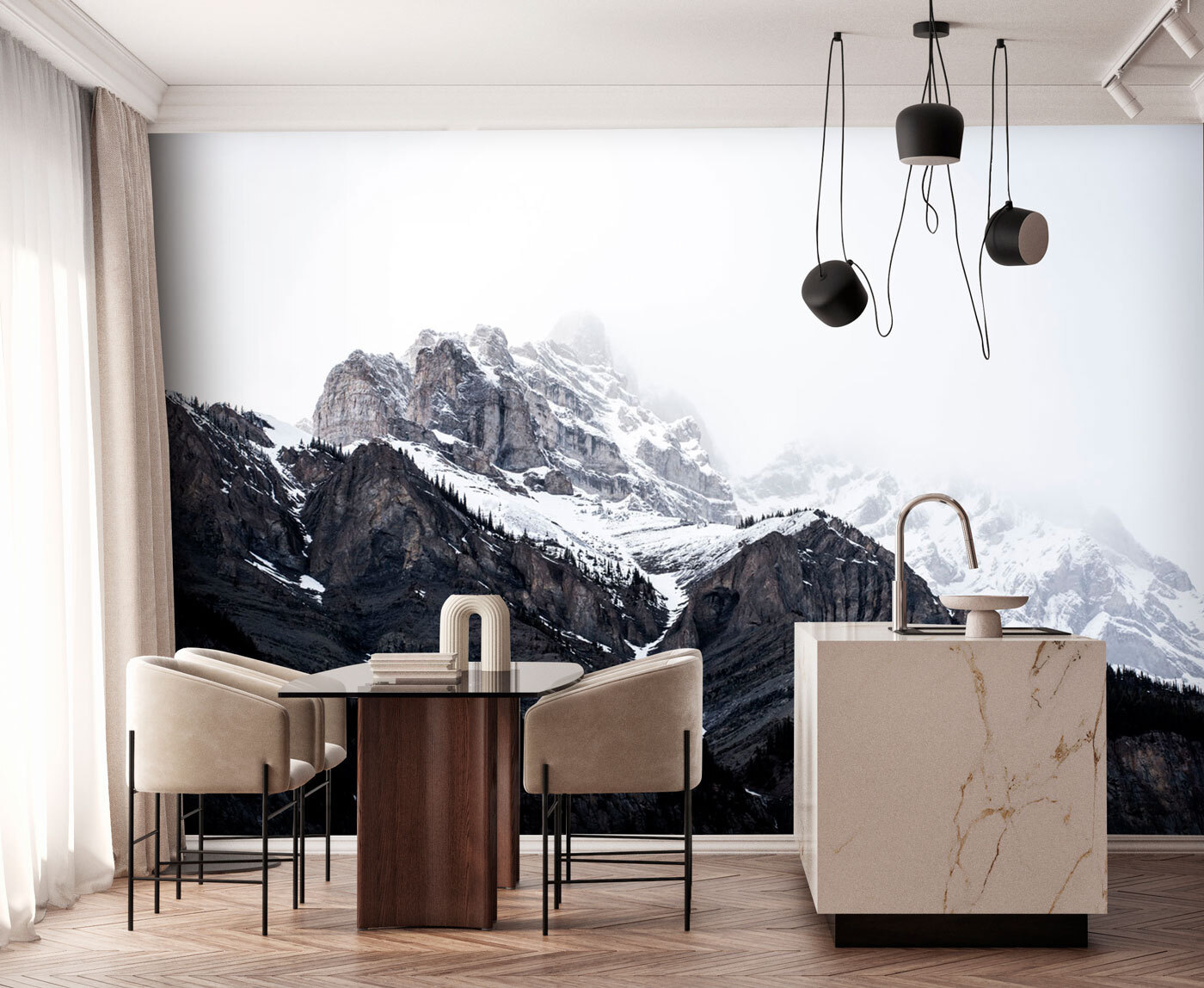 Τοποθετήστε αυτή την τοιχογραφία στο σαλόνι ή την κρεβατοκάμαρά σας και ξαφνικά, κάθε μέρα θα μοιάζει λίγο πιο περιπετειώδης. Μπορείτε σχεδόν να νιώσετε το δροσερό αεράκι και να ακούσετε το απαλό τρίξιμο του χιονιού κάτω από τις μπότες. Επιπλέον, αυτή η έντονη αντίθεση των σκούρων, τραχιών βράχων με το λευκό χιόνι; Τόσο δραματική, αλλά και ηρεμιστική.