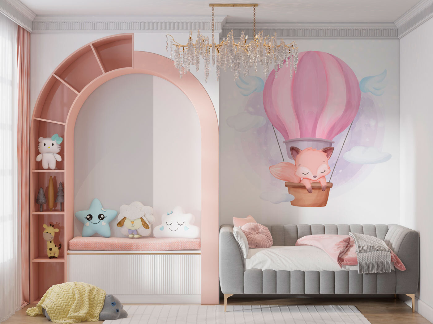 Φανταστείτε να αιωρείστε στη χώρα των ονείρων πάνω σε ένα χνουδωτό σύννεφο, με ένα ροζ αερόστατο να σας μεταφέρει εκεί! Αυτή η τοιχογραφία “Ροζ αερόστατο” είναι ιδανική για το παιδικό δωμάτιο – είτε πρόκειται για τον περιπετειώδη γιο σας είτε για την ονειροπόλο κόρη σας. Τα ονειρικά παστέλ χρώματα και η αξιολάτρευτη νυσταγμένη αλεπού κάνουν αυτή την τοιχογραφία να μοιάζει με μια ζεστή αγκαλιά. Προσθέτει ακριβώς τη σωστή πινελιά ιδιοτροπίας και μαγείας σε κάθε χώρο.
