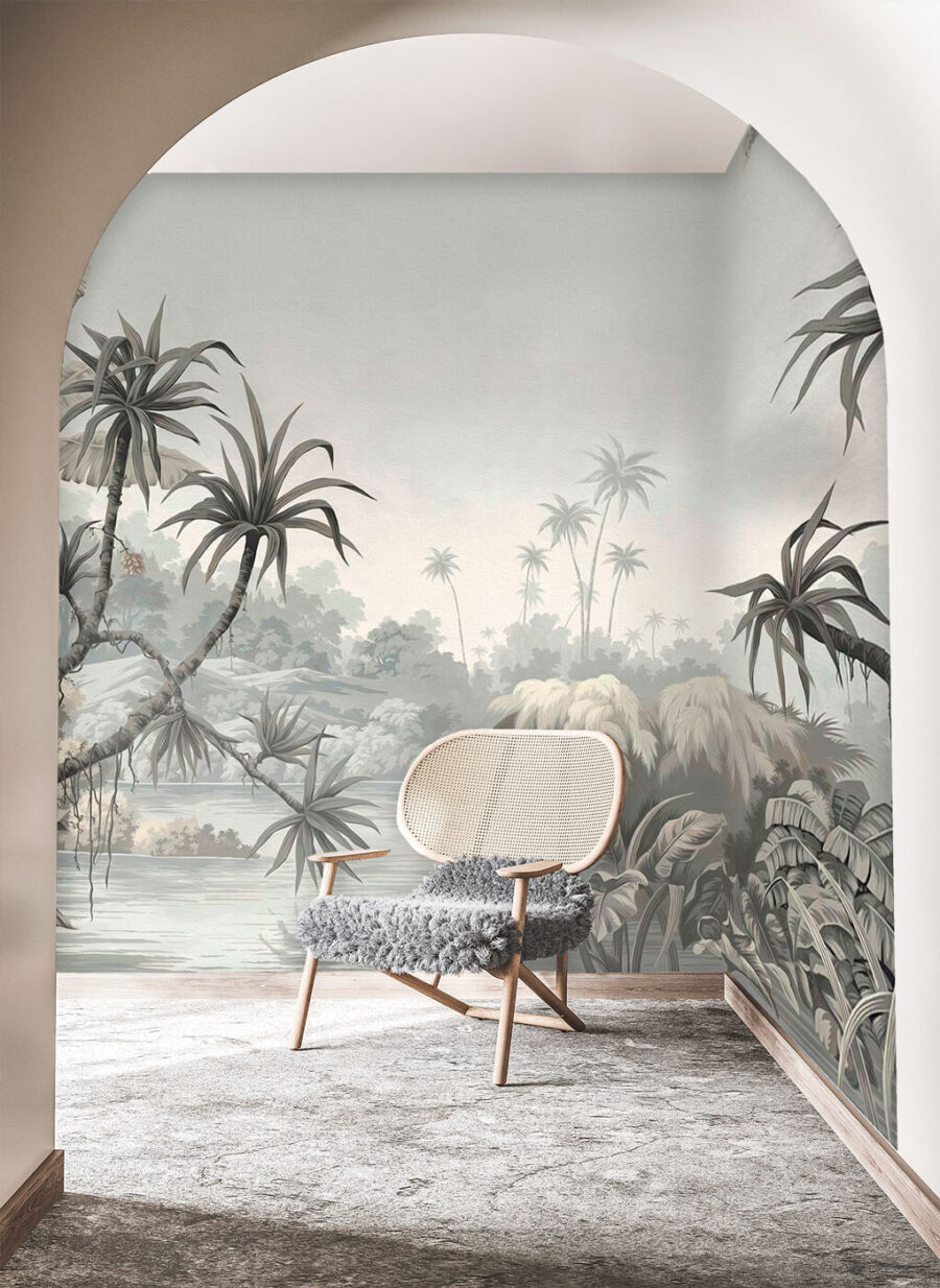 Φανταστείτε να αράζετε στο σαλόνι σας και αντί να κοιτάτε τους άδειους τοίχους, να μεταφέρεστε σε αυτή τη γαλήνια τροπική όαση ακριβώς στο σπίτι σας. Αυτή η τοιχογραφία “Τροπικό τοπίο σε υποτονικούς τόνους” είναι σαν μια ανάσα φρέσκου αέρα με μια δόση μυστηρίου της ζούγκλας. Δεν είναι πολύ δυνατή, αλλά εξακολουθεί να αποτυπώνει αυτή την πλούσια, πράσινη ατμόσφαιρα των πυκνών φυλλωμάτων και των εξωτικών δέντρων.