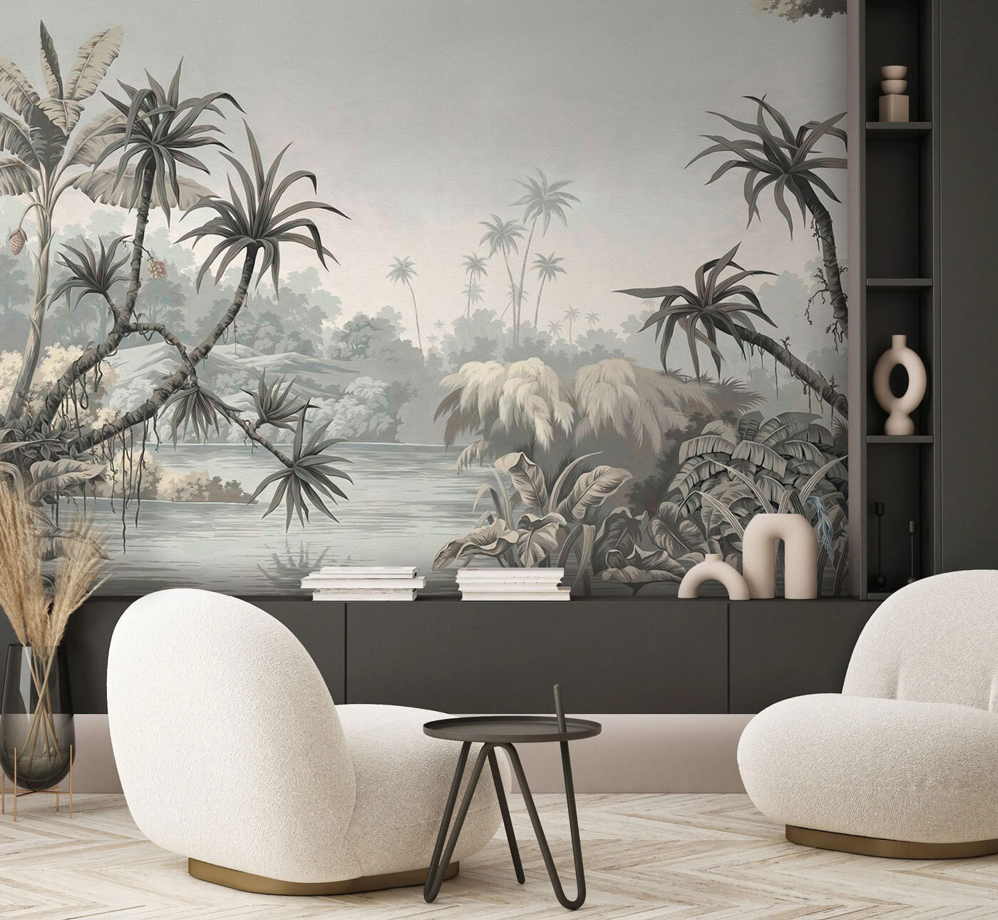 Φανταστείτε να αράζετε στο σαλόνι σας και αντί να κοιτάτε τους άδειους τοίχους, να μεταφέρεστε σε αυτή τη γαλήνια τροπική όαση ακριβώς στο σπίτι σας. Αυτή η τοιχογραφία “Τροπικό τοπίο σε υποτονικούς τόνους” είναι σαν μια ανάσα φρέσκου αέρα με μια δόση μυστηρίου της ζούγκλας. Δεν είναι πολύ δυνατή, αλλά εξακολουθεί να αποτυπώνει αυτή την πλούσια, πράσινη ατμόσφαιρα των πυκνών φυλλωμάτων και των εξωτικών δέντρων.