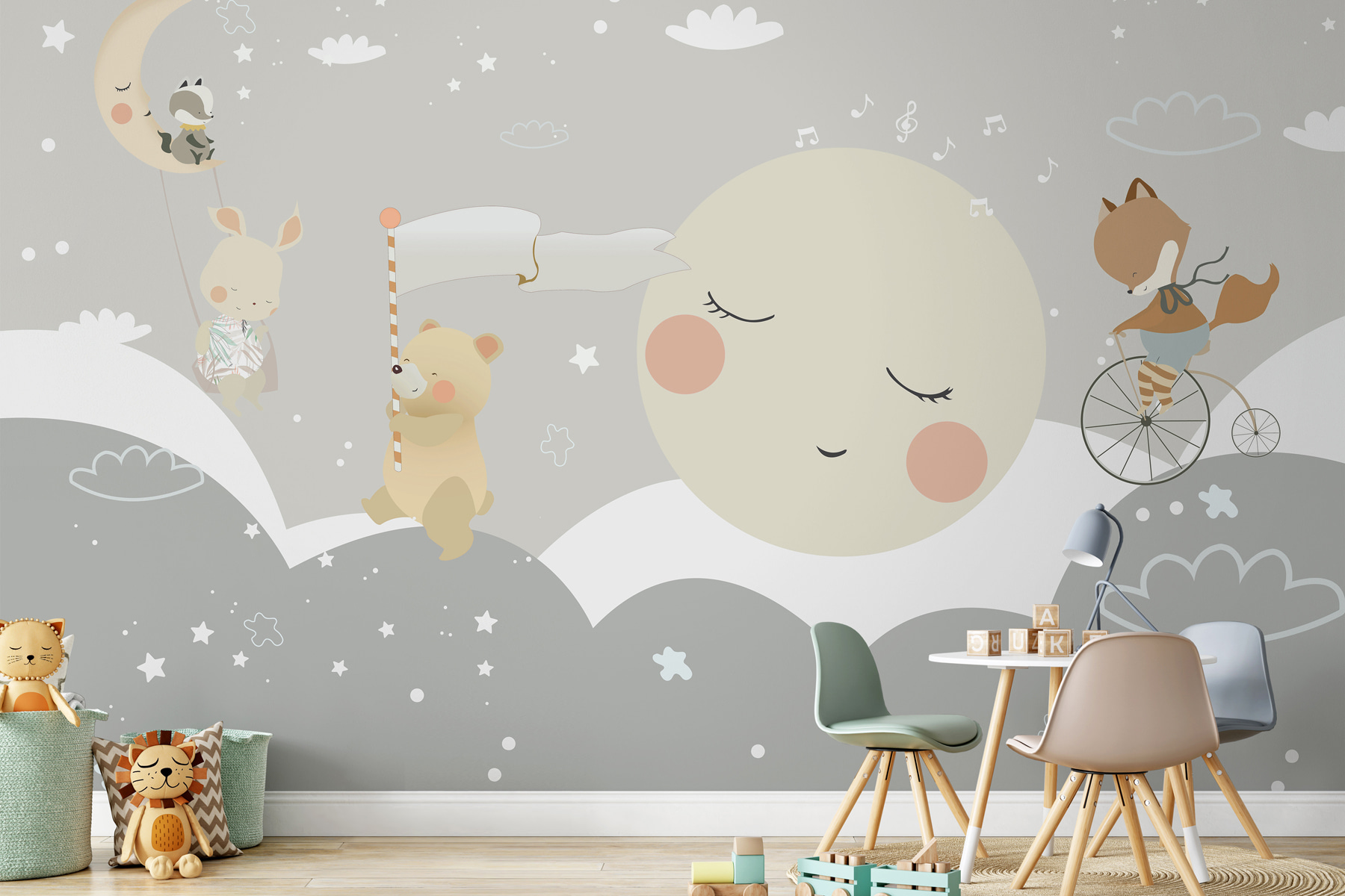 Δείτε αυτή την αξιολάτρευτη τοιχογραφία, “Λευκό αστέρι σε γκρι φόντο”. Είναι σαν να μπαίνεις σε μια ονειρική ιστορία ύπνου, ιδανική για παιδικό δωμάτιο ή παιδότοπο. Αυτή η τοιχογραφία διαθέτει ένα καταπραϋντικό γκρι φόντο πασπαλισμένο με αστέρια που αναβοσβήνουν, ένα αναπαυτικό φεγγάρι και χαριτωμένους ζωικούς φίλους. Φανταστείτε μια νυσταγμένη αρκούδα και μια αλεπού που ιππεύει μια πεντάμορφη φτερούγα – απόλυτη απόλαυση για τους μικρούς εξερευνητές!
