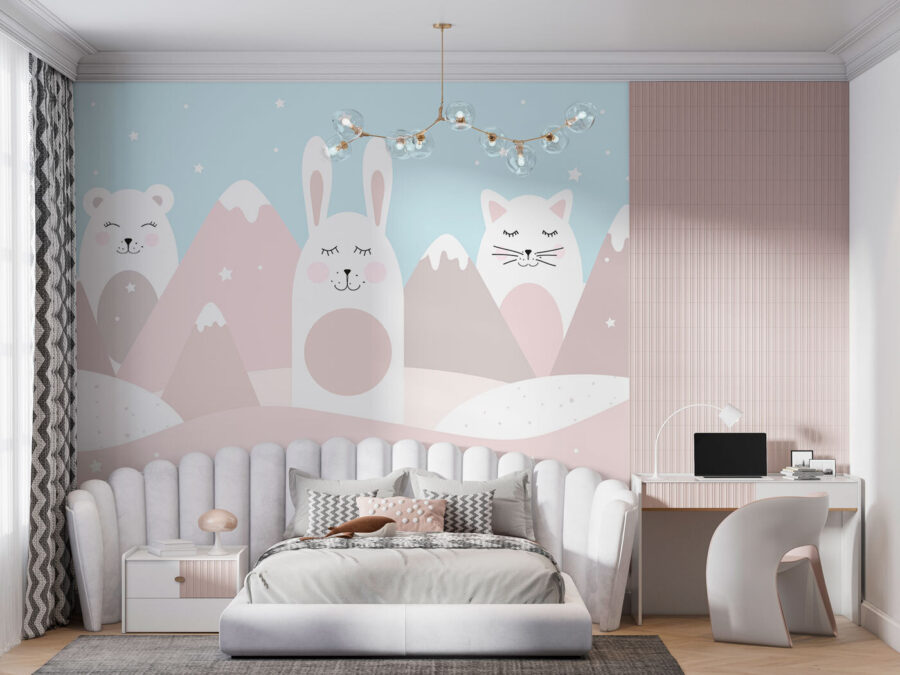 Φανταστείτε να μπαίνετε στο δωμάτιο του παιδιού σας και να σας υποδέχεται το πιο χαριτωμένο τρίο ζώων στα πιο παστέλ, χαλαρωτικά χρώματα. Αυτή η ιδιόρρυθμη τοιχογραφία διαθέτει μια λευκή γάτα με ροζ μάγουλα, φωλιασμένη ανάμεσα σε ένα φιλικό κουνελάκι και μια αρκούδα, όλα μαζί σε ένα ονειρικό τοπίο με απαλά βουνά και αστέρια που αναβοσβήνουν. Είναι σαν ένα παραμύθι που ζωντανεύει! Ιδανική για κάθε μικρό εξερευνητή ή φιλόζωο, αυτή η τοιχογραφία φέρνει μια πινελιά μαγείας και μια δόση χαράς στο χώρο τους. Τα απαλά χρώματα και οι αξιολάτρευτοι χαρακτήρες είναι βέβαιο ότι θα εμπνεύσουν γλυκά όνειρα και μεγάλες περιπέτειες. Οι γονείς το αγαπούν γιατί είναι σαν μια γαλήνια, ευφάνταστη αγκαλιά για το δωμάτιο – ποιος δεν θα το ήθελε αυτό;