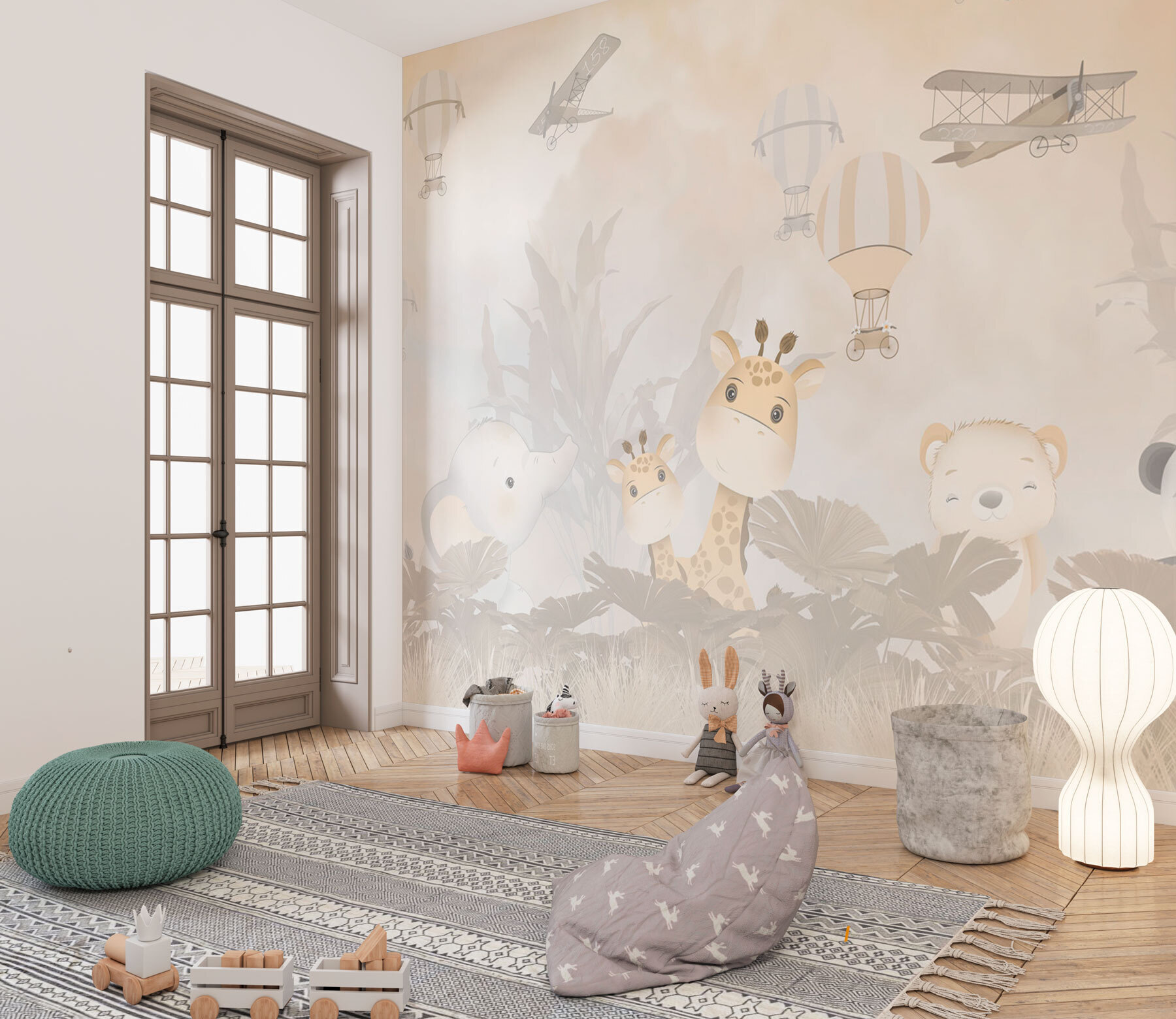 Ιδανική τόσο για γιους όσο και για κόρες, αυτή η τοιχογραφία φέρνει μια αίσθηση περιπέτειας και θαυμασμού. Οι ήπιοι, υποτονικοί τόνοι την καθιστούν μια γαλήνια προσθήκη χωρίς να κατακλύζουν το δωμάτιο. Φανταστείτε το παιδί σας να κοιτάζει ψηλά με ορθάνοιχτα μάτια περιέργειας, ίσως αφηγούμενο ιστορίες για αποδράσεις με ψηλές πτήσεις ή απαλές βόλτες με ελέφαντες κάτω από ουρανούς γεμάτους μπαλόνια.