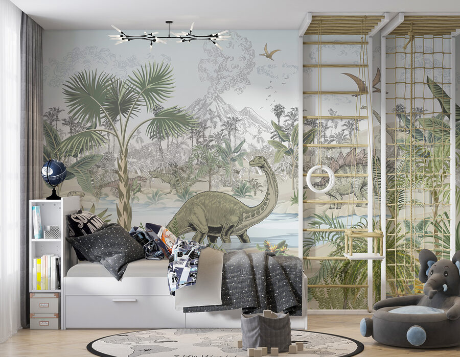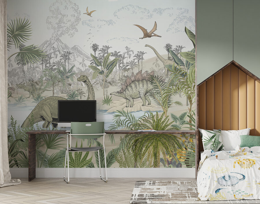 Μεταμορφώστε το χώρο ενός παιδιού σε έναν προϊστορικό παράδεισο με αυτή τη ζωντανή τοιχογραφία με μεγαλοπρεπείς δεινόσαυρους που περιφέρονται στο καταπράσινο τροπικό τους σπίτι. Φανταστείτε τον ενθουσιασμό καθώς τα μικρά παιδιά ατενίζουν αυτούς τους ευγενικούς γίγαντες, εξερευνώντας τον φανταστικό τους κόσμο. Με τους φοίνικες να λικνίζονται και ένα ηφαίστειο να φουσκώνει στο φόντο, αυτή η τοιχογραφία πυροδοτεί τη φαντασία και τις περιπέτειες που ξεπερνούν τα παραμύθια.