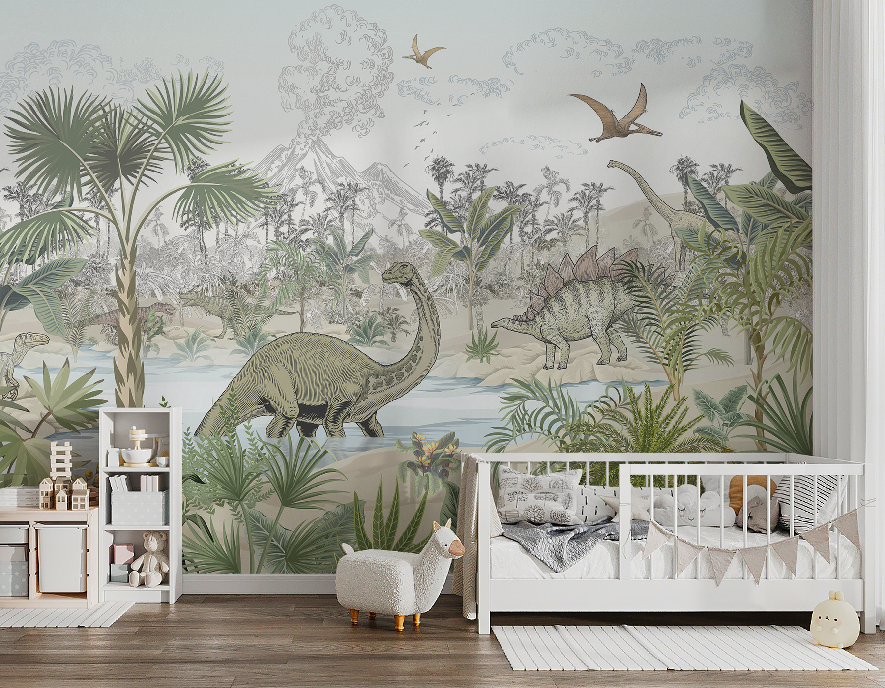 Μεταμορφώστε το χώρο ενός παιδιού σε έναν προϊστορικό παράδεισο με αυτή τη ζωντανή τοιχογραφία με μεγαλοπρεπείς δεινόσαυρους που περιφέρονται στο καταπράσινο τροπικό τους σπίτι. Φανταστείτε τον ενθουσιασμό καθώς τα μικρά παιδιά ατενίζουν αυτούς τους ευγενικούς γίγαντες, εξερευνώντας τον φανταστικό τους κόσμο. Με τους φοίνικες να λικνίζονται και ένα ηφαίστειο να φουσκώνει στο φόντο, αυτή η τοιχογραφία πυροδοτεί τη φαντασία και τις περιπέτειες που ξεπερνούν τα παραμύθια.
