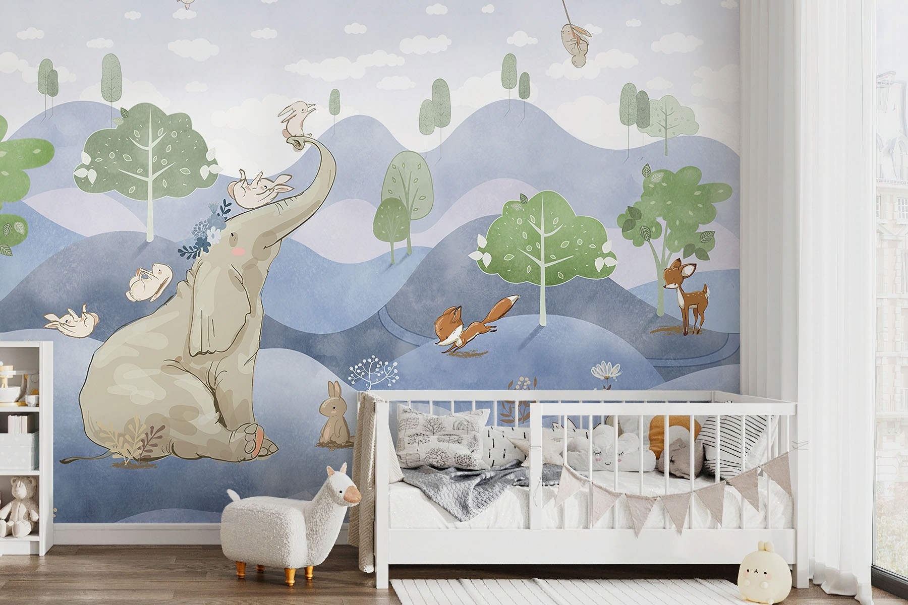 Φανταστείτε να μεταμορφώσετε το δωμάτιο ενός παιδιού σε μια αλλόκοτη χώρα των θαυμάτων με αυτή την παιχνιδιάρικη τοιχογραφία. Με ένα αξιολάτρευτο κουνέλι που κρατάει ένα λουλούδι, το οποίο πλαισιώνεται από ένα χαρούμενο καστ από ζωάκια όπως ένας ελέφαντας, μια αλεπού και ένα ελάφι, είναι βγαλμένο από παραμύθι. Τα παστέλ χρώματα και το ονειρικό τοπίο φέρνουν μια αίσθηση ηρεμίας και χαράς – τέλεια για να κεντρίσουν τη φαντασία των μικρών. Φανταστείτε παραμύθια που ζωντανεύουν ή τεμπέλικα απογεύματα που χάνονται σε ονειροπολήσεις. Αφήστε αυτή την τοιχογραφία να φωτίσει κάθε χώρο, δημιουργώντας ένα μαγικό καταφύγιο όπου συνυπάρχουν η περιπέτεια και η γαλήνη.