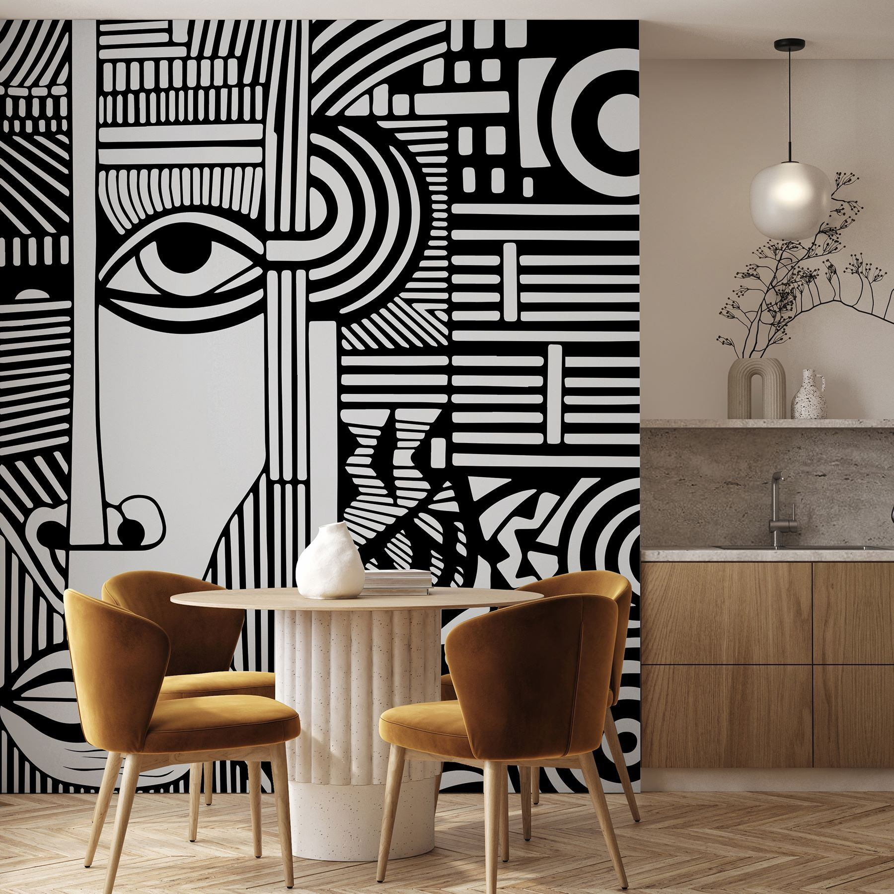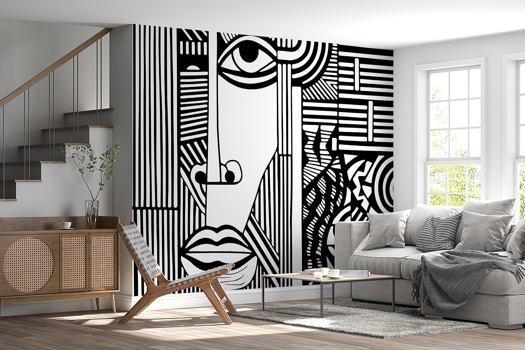 Αυτή δεν είναι απλώς μια τοιχογραφία – είναι ένα κομμάτι μοντέρνας τέχνης που μπορεί να μεταμορφώσει εντελώς το χώρο σας. Με τις περίπλοκες ασπρόμαυρες γραμμές που σχηματίζουν ένα αφηρημένο πρόσωπο, είναι σαν να έχετε ένα αριστούργημα εμπνευσμένο από τον Πικάσο στον τοίχο σας, ακριβώς στο σαλόνι σας. Τα τολμηρά μοτίβα και οι εντυπωσιακές αντιθέσεις καθιστούν αδύνατο να το αγνοήσει κανείς.