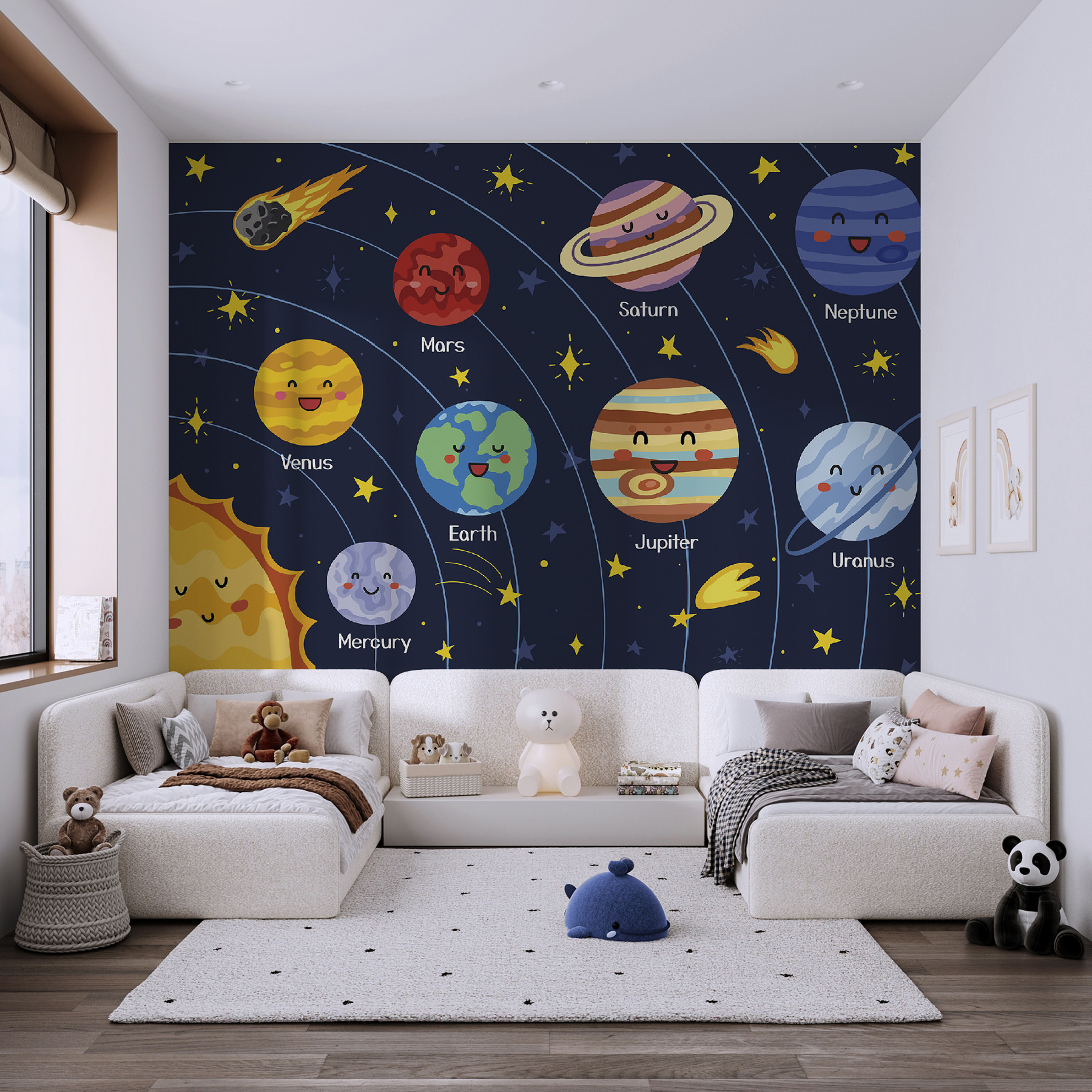 Ψάχνετε να δώσετε στο παιδικό σας δωμάτιο λίγη γοητεία από τον άλλο κόσμο; Δείτε αυτή την αξιολάτρευτη τοιχογραφία “Cartoon of a Planet”! Ιδανική για μικρούς αστροναύτες και αστρονόμους, διαθέτει μια διασκεδαστική και πολύχρωμη σκηνή γαλαξία. Οι πλανήτες έχουν τις πιο χαριτωμένες φατσούλες – σχεδόν ζητούν ένα high-five. Φανταστείτε το πρόσωπο του παιδιού σας να φωτίζεται καθώς πέφτει για ύπνο κάτω από ένα σύμπαν που είναι εντελώς δικό του.
