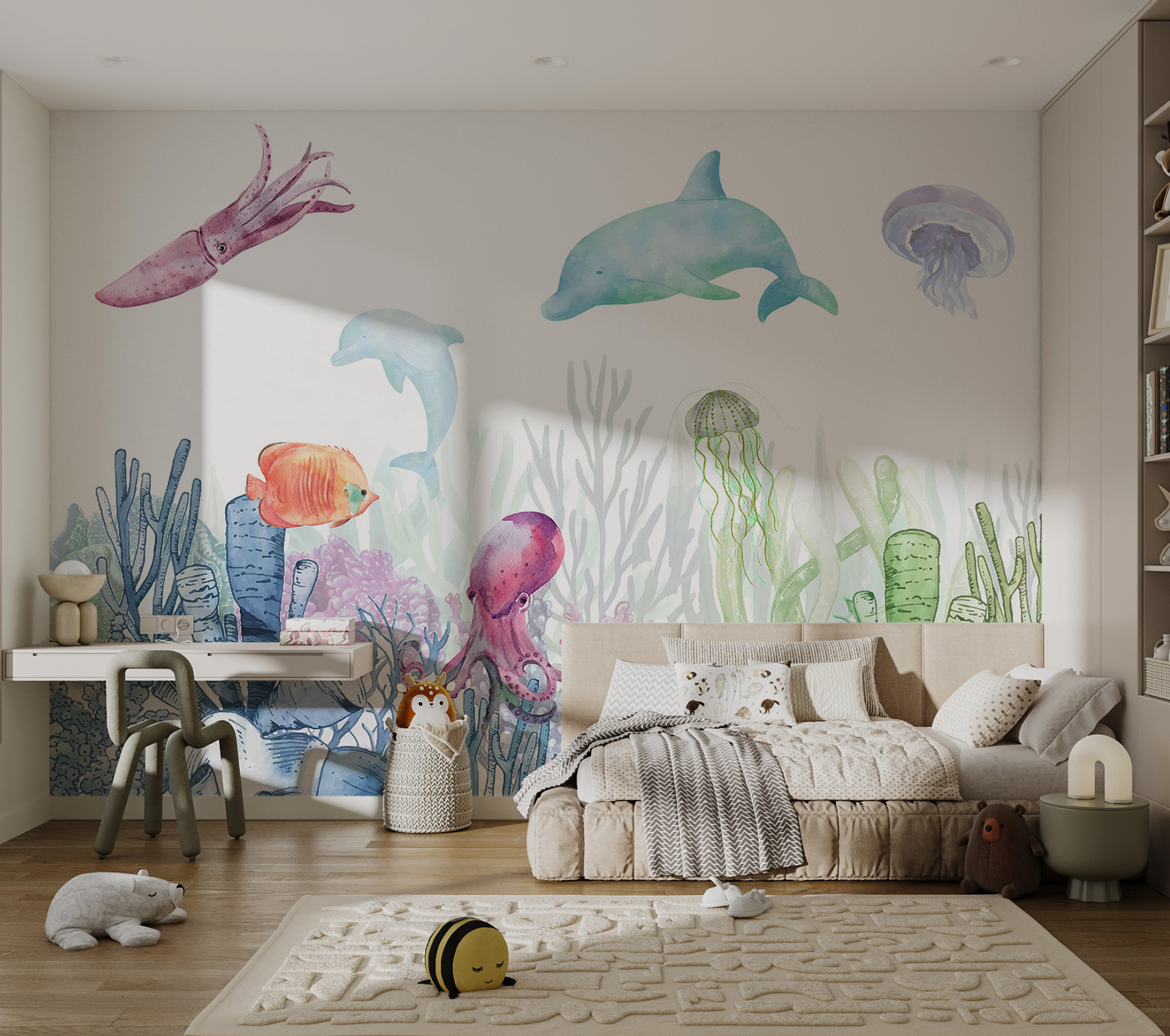 Θέλατε ποτέ να φέρετε τη μαγεία του υποβρύχιου κόσμου στο σπίτι σας; Δείτε αυτή τη γοητευτική τοιχογραφία ακουαρέλας με ένα καλαμάρι και τους υδρόβιους φίλους του! Ιδανική για τα παιδικά υπνοδωμάτια, είτε πρόκειται για το παιδικό δωμάτιο του μικρού σας είτε για τον χώρο χαλάρωσης του εφήβου σας. Έχει αυτή την ονειρική, παραθαλάσσια ατμόσφαιρα που θα κάνει τον καθένα να νιώθει ότι βουτάει σε μια περιπέτεια κάθε φορά που μπαίνει στο δωμάτιο.