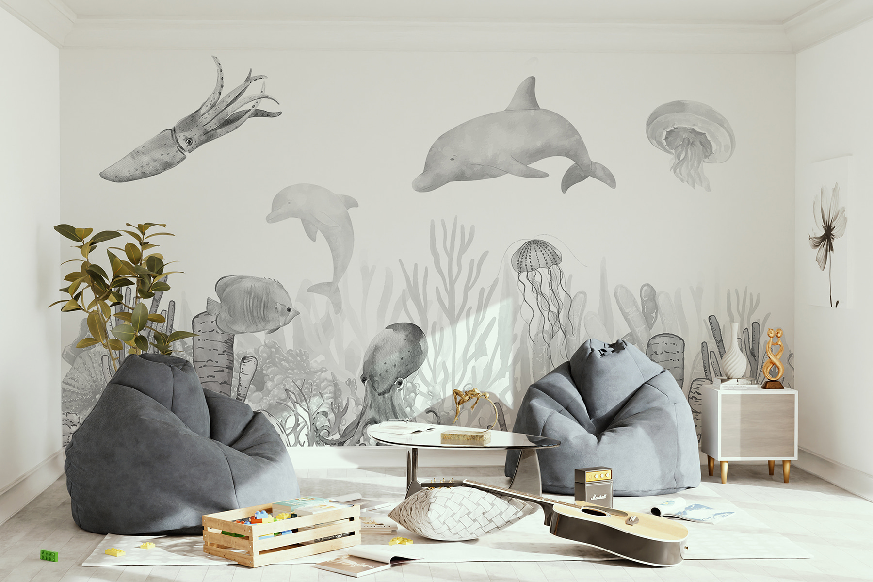 Φανταστείτε αυτή την τοιχογραφία να φωτίζει το δωμάτιο του παιδιού σας ή τον δικό σας δημιουργικό χώρο – είναι σαν να έχετε μια βουτιά από τη μαγεία του ωκεανού σε εσωτερικό χώρο. Η ιδιόρρυθμη υδατογραφία ενός καλαμαριού, ανάμεσα σε άλλα θαλάσσια πλάσματα, μοιάζει ζωντανή και παιχνιδιάρικη. Φανταστείτε το: ένα μείγμα υποβρύχιας περιπέτειας και καλλιτεχνικής γοητείας. Είτε είστε ένας έφηβος που ονειρεύεται τον ωκεανό, είτε ένα νήπιο που γοητεύεται από τη θαλάσσια ζωή, είτε ένας ενήλικας που χρειάζεται μια γαλήνια απόδραση, αυτή η τοιχογραφία σας τυλίγει σε ένα απαλό, ευφάνταστο θαλάσσιο τοπίο. Δεν είναι απλά μια συνηθισμένη τέχνη τοίχου, είναι μια πύλη για τα θαύματα της βαθιάς γαλάζιας θάλασσας, ακριβώς στη ζεστή σας γωνιά!
