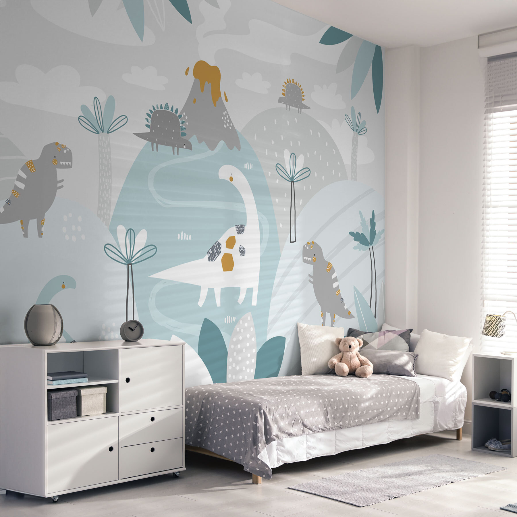 Σκεφτήκατε ποτέ να ταξιδέψετε πίσω στην εποχή των δεινοσαύρων, αλλά, ξέρετε, παραμένοντας στη ζεστή γωνιά σας; Αυτή η τοιχογραφία σας καλύπτει! Με το καταπραϋντικό μπλε και λευκό φόντο του, το οποίο είναι διάσπαρτο με ευφάνταστες λευκές κουκίδες, μοιάζει με ένα ονειρικό τοπίο όπου οι διασκεδαστικοί δεινόσαυροι κυκλοφορούν ελεύθερα. Φανταστείτε το παιδάκι σας να ξυπνάει κάθε πρωί και να ακούει έναν φιλικό βραχιόσαυρο να λέει “γεια σας” – εγγυημένα στιγμιαία χαμόγελα!