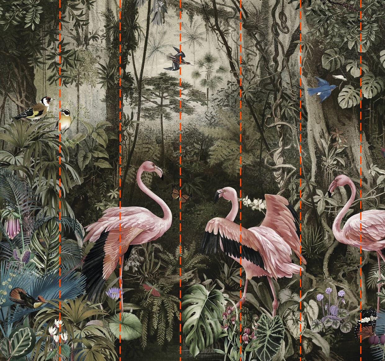 Ταπετσαρίες Φλαμίνγκο κοσμούν μια καταπράσινη σκηνή ζούγκλας