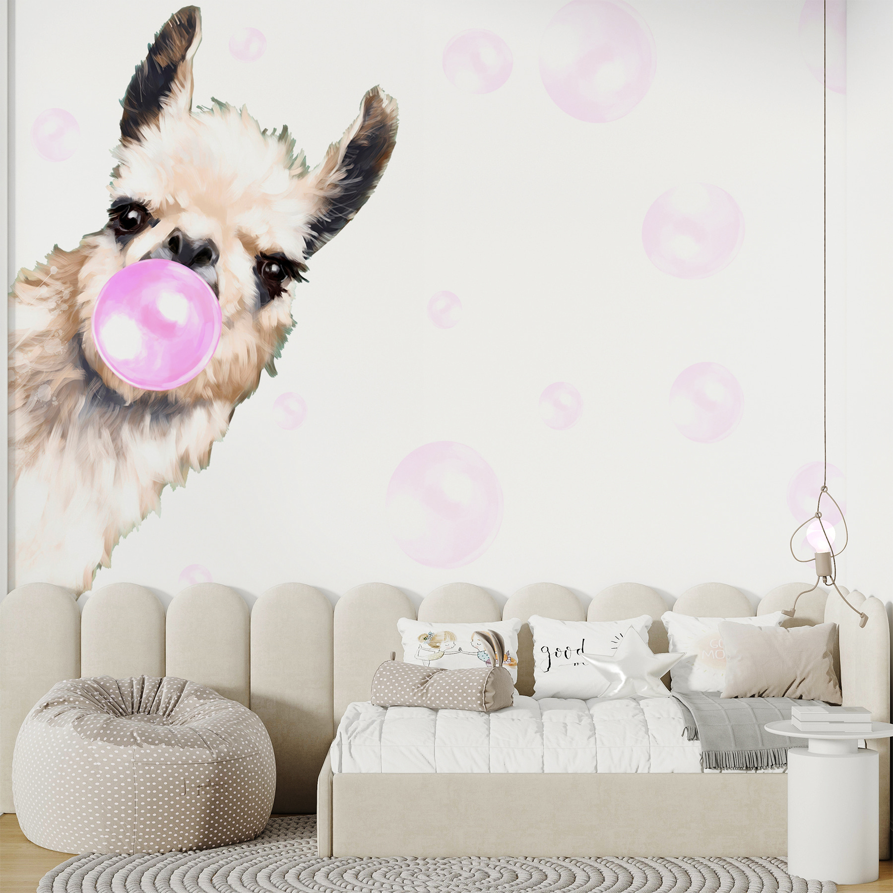 Φανταστείτε να μπαίνετε σε ένα δωμάτιο και να σας υποδέχεται ένα λάμα που φυσάει μια ροζ φούσκα – είναι αμέσως διασκεδαστικό! Αυτή η τοιχογραφία δεν είναι απλώς διακόσμηση, είναι σαν να έχετε έναν ιδιόρρυθμο φίλο στον τοίχο σας. Ιδανική για το δωμάτιο της κόρης ή το στέκι ενός εφήβου, αποτυπώνει αυτό το παιχνιδιάρικο πνεύμα που φέρνει χαμόγελα. Τα απαλά χρώματα και ο ιδιόρρυθμος σχεδιασμός προσθέτουν μια ανάλαφρη ατμόσφαιρα, δημιουργώντας έναν χώρο που μοιάζει ζωντανός αλλά και φιλόξενος. Απλά φανταστείτε τη χαρά ή τα χαχανητά που μπορεί να εμπνεύσει κατά τη διάρκεια μιας βραδιάς ταινίας. Δεν είναι απλώς ένας τοίχος, είναι μια εμπειρία που περιμένει να συμβεί. Ιδανικό για όποιον θέλει να δώσει λίγη χαρά στο χώρο του.