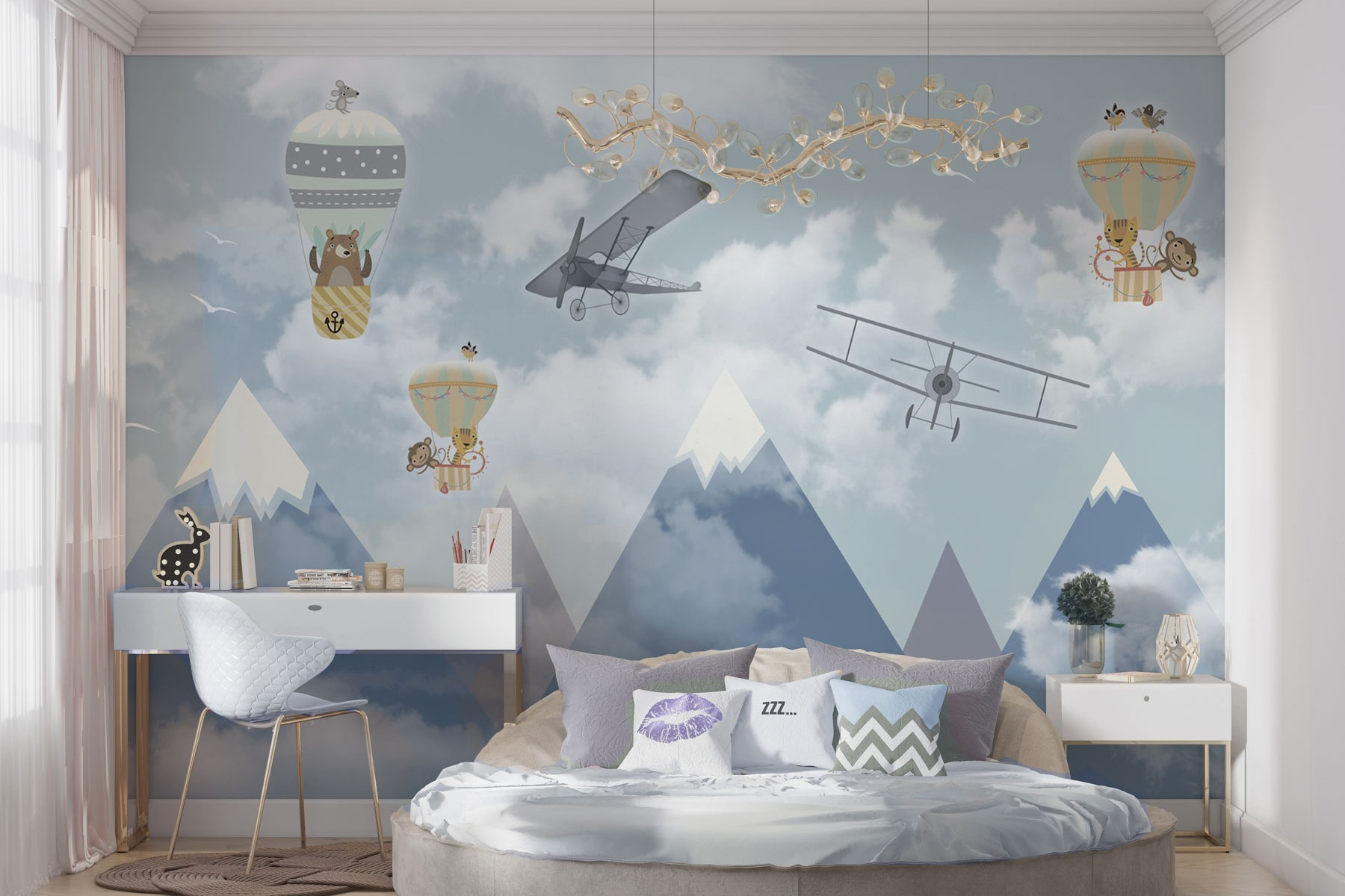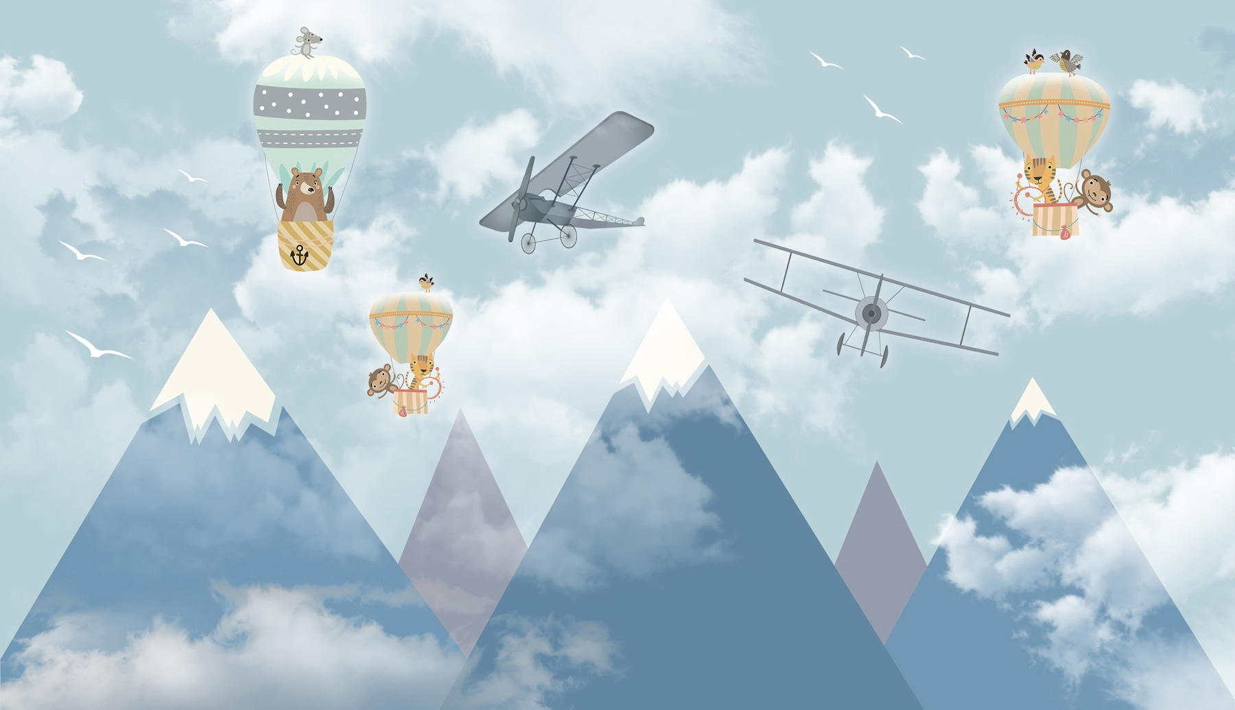 Αυτή η απολαυστική τοιχογραφία τοίχου, με μια ιδιόρρυθμη ομάδα από αερόστατα και παιχνιδιάρικα αεροπλάνα που πετούν σε έναν ονειρικό ουρανό, δημιουργεί μια γοητευτική ατμόσφαιρα σε κάθε χώρο. Φανταστείτε τα μικρά παιδιά να ατενίζουν το νέο τους τοίχο, με τη φαντασία τους να πετάει μαζί με φιλικές αρκούδες και περίεργα ζωάκια. Είναι σαν να προσκαλείτε λίγη περιπέτεια στο σπίτι σας! Το απαλό μπλε και το απαλό λευκό προσθέτουν μια ηρεμιστική πινελιά, ιδανική για παιδικά δωμάτια ή χώρους παιχνιδιού. Ποιος δεν θα ήθελε να ονειρεύεται κάθε βράδυ την εξερεύνηση του ουρανού; Είναι απλώς μια τοιχογραφία, αλλά είναι επίσης μια πύλη για ατελείωτες περιπέτειες.
