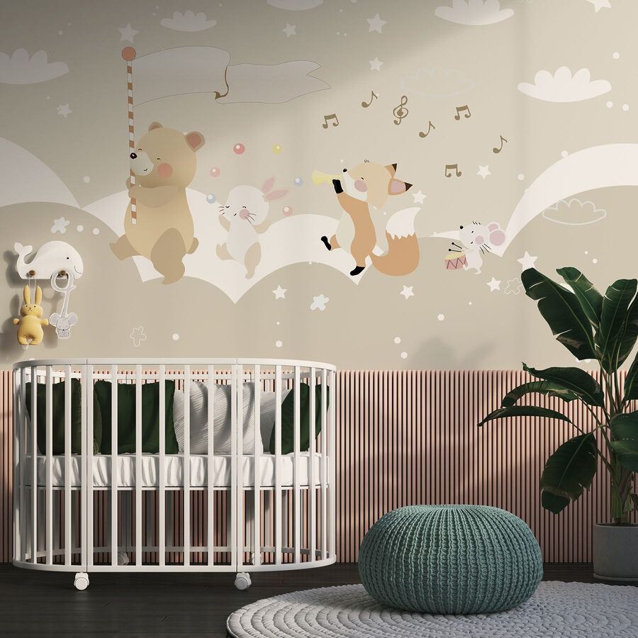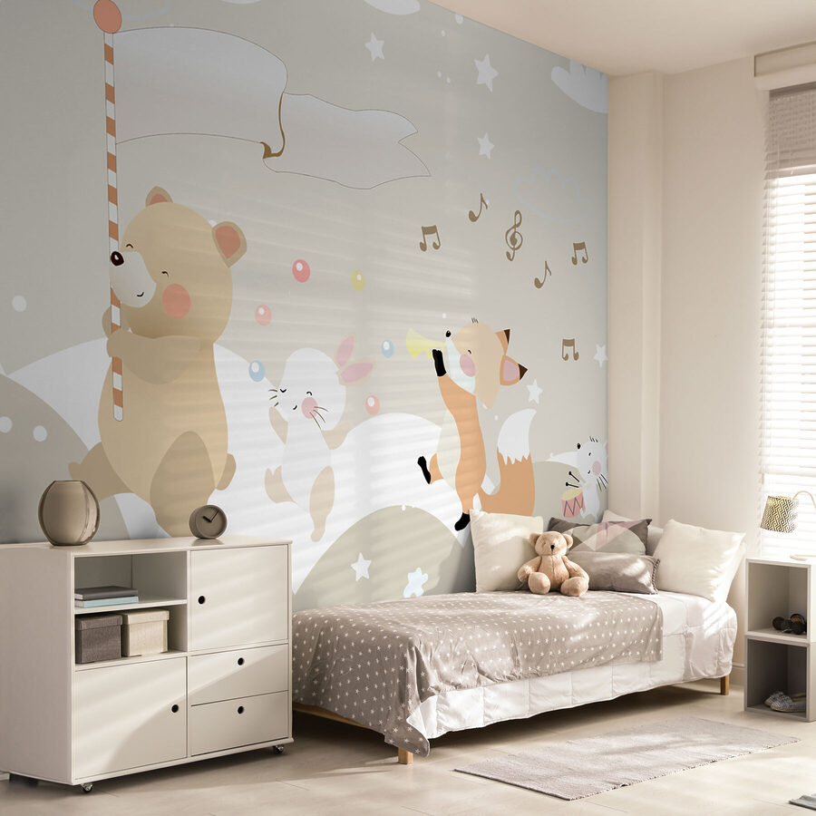 Μεταμορφώστε το δωμάτιο ενός παιδιού σε μια αλλόκοτη χώρα των θαυμάτων με αυτή την απολαυστική τοιχογραφία με ένα χαρούμενο αρκουδάκι και τη χαρούμενη παρέα των δασικών του φίλων. Φανταστείτε τα μικρά παιδιά να ξυπνούν σε μια παιχνιδιάρικη σκηνή όπου ένα αρκουδάκι κουνάει ένα ζαχαροκάλαμο σαν σημαία, προσκαλώντας όνειρα γεμάτα γλυκύτητα και διασκέδαση. Υπάρχει μια αλεπού που χορεύει και ένα λαγουδάκι που πηδάει- είναι σαν μια μικρή παρέλαση ακριβώς στον τοίχο! Τα απαλά χρώματα και οι χαρούμενες εκφράσεις δημιουργούν μια καταπραϋντική ατμόσφαιρα, πυροδοτώντας τη φαντασία και το γέλιο. Ιδανικό για παιδικά δωμάτια ή παιδικούς σταθμούς, είναι το είδος της διακόσμησης που μετατρέπει τις καθημερινές στιγμές σε περιπέτεια -ποιος ξέρει τι ιστορίες θα εκτυλιχθούν εδώ; Μια απλή πινελιά που έχει μεγάλο αντίκτυπο!