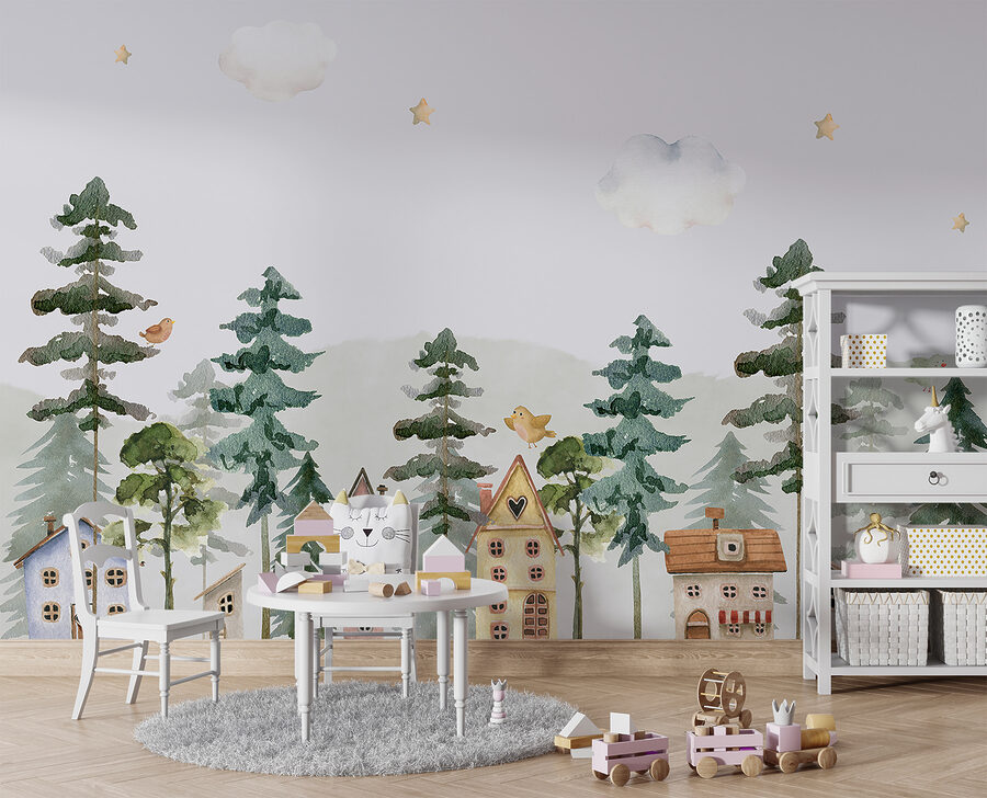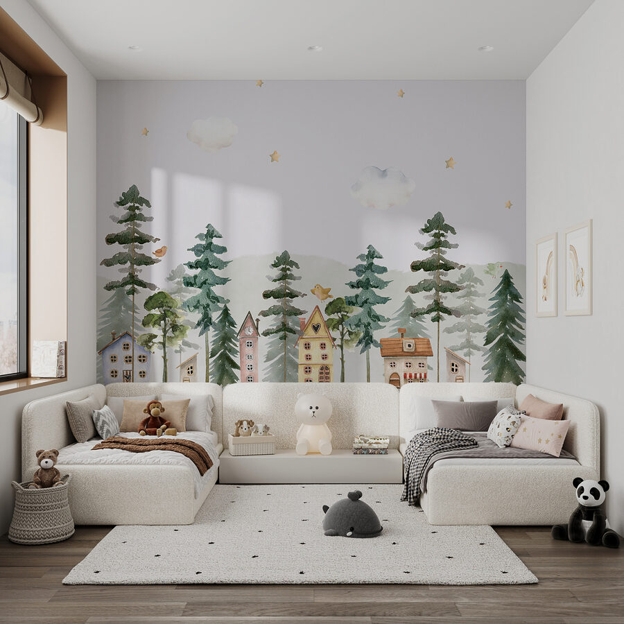 Ω, η γοητεία της ακουαρέλας και η ζεστασιά μιας ζεστής σκηνής σπιτιού! Αυτό το “Ταπετσαρίες Watercolor of a House” μεταμορφώνει αμέσως κάθε χώρο σε ένα ιδιόρρυθμο καταφύγιο. Φανταστείτε να μπαίνετε σε ένα δωμάτιο όπου μικροσκοπικά ζωγραφισμένα σπιτάκια ξεπροβάλλουν ανάμεσα σε καταπράσινα δέντρα, με απαλά σύννεφα και αστέρια να αιωρούνται από πάνω – είναι ένας μικρός κόσμος παραμυθιού στον τοίχο σας! Ιδανικό για παιδικά δωμάτια ή παιδικά δωμάτια, προσθέτει μια καταπραϋντική, ονειρική ατμόσφαιρα. Οι περίτεχνες λεπτομέρειες, όπως τα παράθυρα σε σχήμα καρδιάς και τα πουλιά που κάθονται στα δέντρα, προσκαλούν σε ατελείωτο παιχνίδι με τη φαντασία. Ακόμα και σε μια ανήσυχη νύχτα, είναι σαν μια απαλή υπενθύμιση της ηρεμίας και της μαγείας. Εύκολο στα μάτια και γεμάτο χαρακτήρα – αυτή η τοιχογραφία είναι σαν ένας παλιός φίλος στο σπίτι σας.