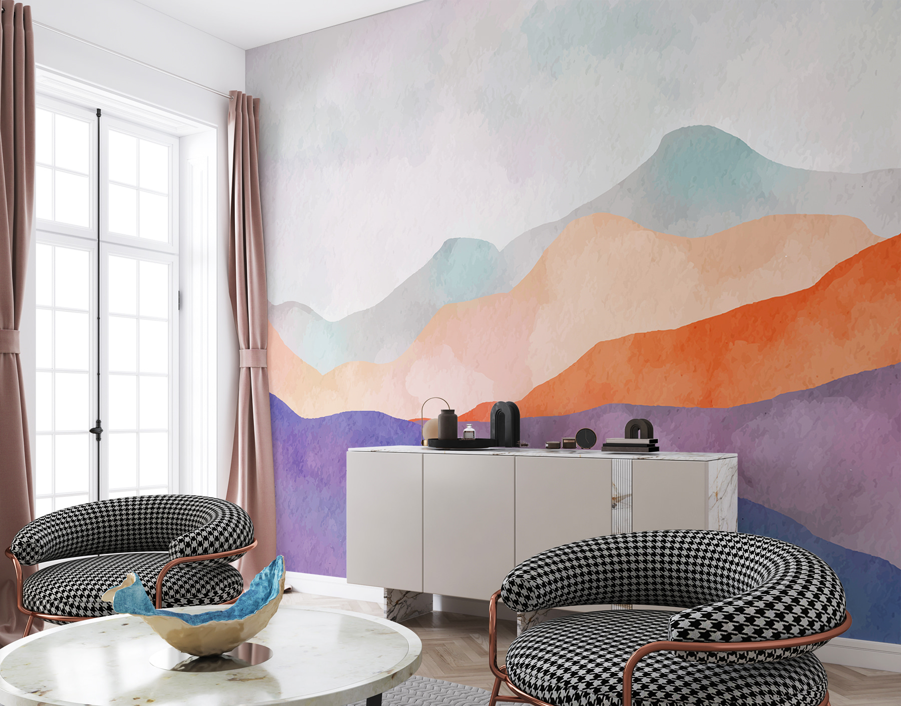 Σκεφτήκατε ποτέ να κάνετε μια βόλτα σε ένα ονειρικό τοπίο ακουαρέλας μέσα στο σαλόνι σας; Αυτή είναι η ατμόσφαιρα που αποκομίζετε από αυτή την τοιχογραφία. Είναι σαν κάποιος να συνέλαβε την ουσία ενός απαλού, ομιχλώδους πρωινού στα βουνά και να την έριξε στον τοίχο σας. Το μείγμα των χρωμάτων είναι τόσο καταπραϋντικό – παστέλ μπλε, απαλά πορτοκαλί και μοβ που λιώνουν μεταξύ τους σαν ένα γαλήνιο ηλιοβασίλεμα. Φανταστείτε να πίνετε τον καφέ σας, να κοιτάτε ψηλά και να αισθάνεστε αμέσως χαλαροί – σχεδόν σαν να κοιτάτε από το παράθυρο μιας καμπίνας τις μακρινές κορυφές. Ιδανικό για όποιον αγαπάει την καλή ατμόσφαιρα της φύσης.