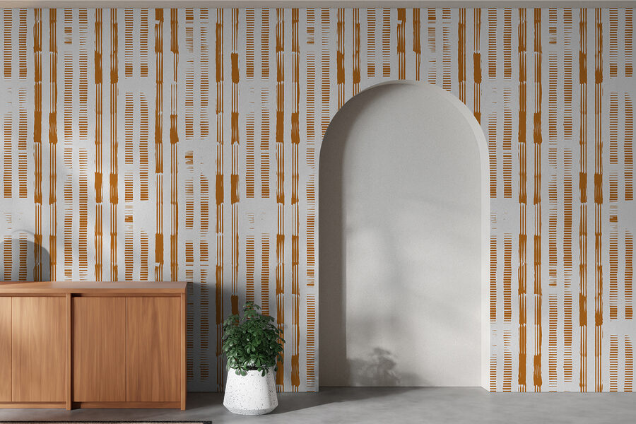 Δείτε αυτή την εντυπωσιακή τοιχογραφία τοίχου με κάθετο ριγέ μοτίβο και σκόπιμα κενά – ιδανική για να προσθέσετε λίγο μοντέρνο στυλ στο χώρο σας! Βρίσκεται στη χρυσή τομή μεταξύ αφηρημένων και ριγέ σχεδίων, καθιστώντας την μια ξεχωριστή επιλογή για όποιον θέλει κάτι μοναδικό αλλά και ευέλικτο. Φανταστείτε το στο σαλόνι ή το γραφείο σας: οι καθαρές γραμμές και το οργανωμένο μοτίβο είναι παιχνιδιάρικα αλλά και εκλεπτυσμένα. Επιπλέον, οι γήινοι πορτοκαλί τόνοι προσδίδουν μια ζεστή, άνετη αίσθηση που είναι τόσο φιλόξενη.