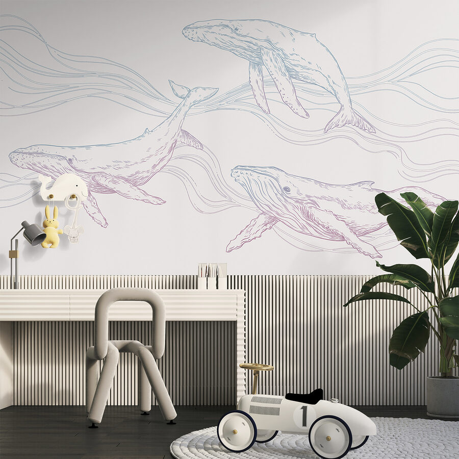 Μεταμορφώστε οποιοδήποτε δωμάτιο σε μια απόδραση στον ωκεανό με αυτή την εκπληκτική τοιχογραφία τοίχου με μια ομάδα φαλαινών που κολυμπούν με χάρη μέσα στο νερό. Φανταστείτε να ξυπνάτε με την απαλή, καταπραϋντική παρουσία αυτών των μεγαλόπρεπων πλασμάτων, καθένα από τα οποία αποτελεί υπενθύμιση της ομορφιάς του απέραντου γαλάζιου. Οι απαλές, ρέουσες γραμμές και οι παστέλ αποχρώσεις δημιουργούν μια γαλήνια ατμόσφαιρα – ιδανική για ένα άνετο σαλόνι ή ένα ηρεμιστικό υπνοδωμάτιο. Είναι σαν να έχετε ένα κομμάτι της θάλασσας στο σπίτι σας. Οι φίλοι θα θαυμάσουν την τέχνη και ποιος δεν θα αισθανόταν λίγο πιο χαλαρός περιτριγυρισμένος από τους γίγαντες της φύσης; Βυθιστείτε σε έναν κόσμο που φέρνει τα θαύματα του ωκεανού στην καθημερινότητά σας.