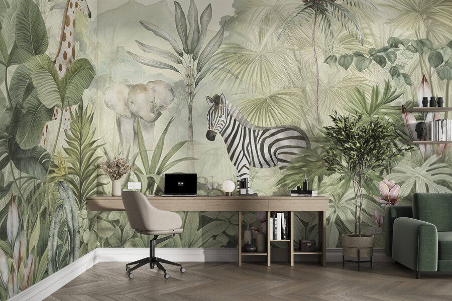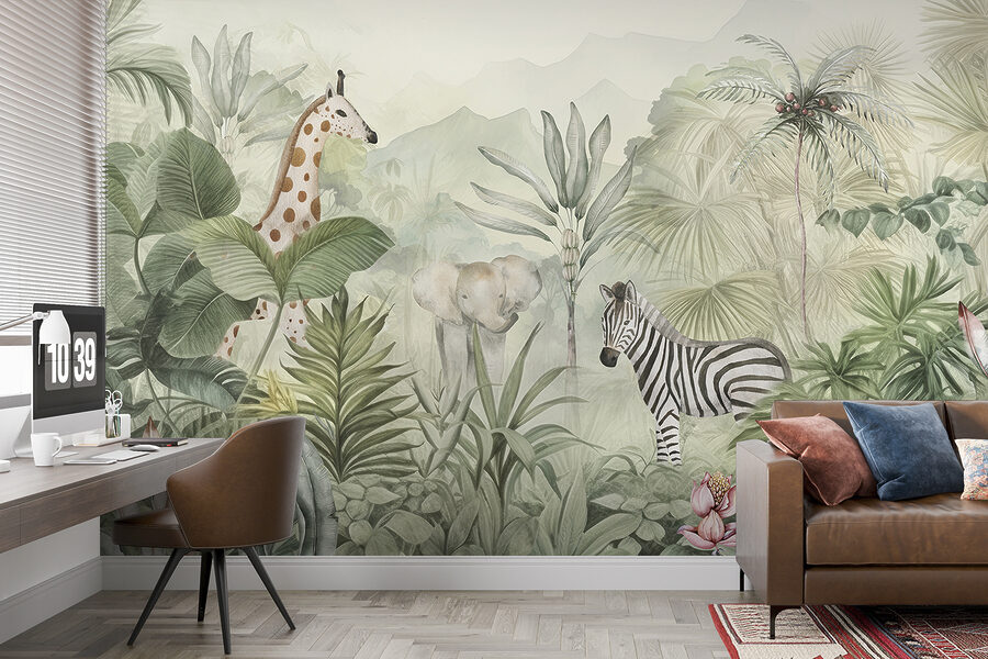 Φανταστείτε να μπαίνετε σε μια ζούγκλα γεμάτη ζωή – αλλά στο δικό σας δωμάτιο! Αυτή η τοιχογραφία τοίχου “Animals Roam Tranquil Jungle Landscape” είναι καθαρή μαγεία για τα μάτια. Ελέφαντες, ζέβρες και καμηλοπαρδάλεις περιπλανώνται ειρηνικά σε αυτό το καταπράσινο τοπίο που είναι τόσο ζωντανό, που σχεδόν θα νιώσετε την υγρασία! Ιδανική για παιδιά και βρέφη, είναι ένα καταπραϋντικό μείγμα περιπέτειας και γαλήνης, που πυροδοτεί την πιο άγρια φαντασία. Τα απαλά παστέλ χρώματα και οι περίπλοκες λεπτομέρειες το κάνουν να ξεχωρίζει σε κάθε χώρο. Ιδανικό για τους λάτρεις της φύσης ή για όσους απλά θέλουν να αποδράσουν – χωρίς να φύγουν από το σπίτι.