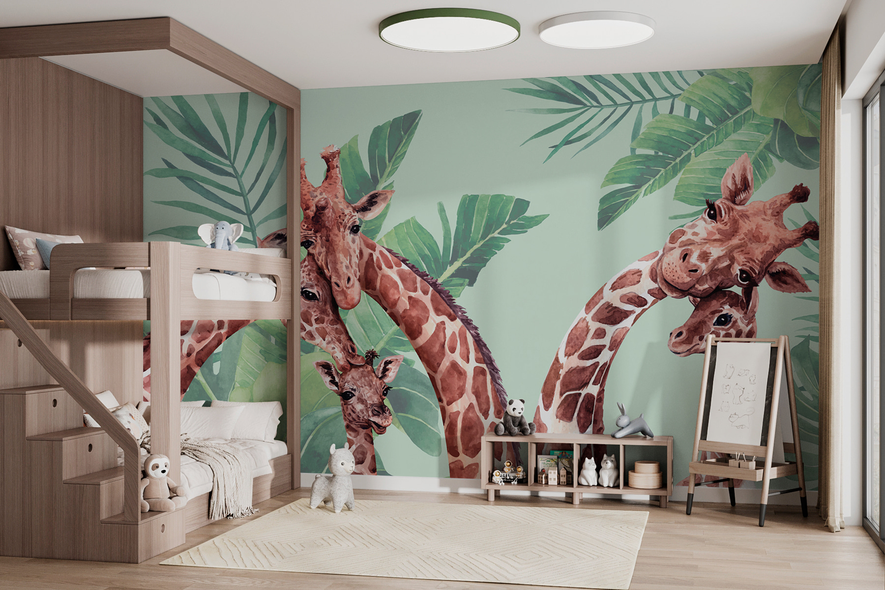 Φανταστείτε να μπαίνετε σε ένα δωμάτιο και να σας υποδέχεται μια χαρούμενη ομάδα καμηλοπαρδάλεις σε ένα καταπράσινο σκηνικό. Αυτή η τοιχογραφία είναι σαν να φέρνετε ένα χαρούμενο κομμάτι σαφάρι στο σπίτι σας. Ιδανική για παιδικά δωμάτια, παιδικούς σταθμούς ή για κάθε χώρο που χρειάζεται μια διασκεδαστική, εμπνευσμένη από τη φύση πινελιά. Κάθε καμηλοπάρδαλη, με την αξιολάτρευτη, ευγενική έκφρασή της, μοιάζει να λέει: “Γεια σου, φίλε!” Είναι σχεδόν σαν αυτά τα μεγαλόσωμα ζώα να ξεπροβάλλουν από μια ζούγκλα, προσθέτοντας μια αίσθηση περιπέτειας και ιδιοτροπίας. Αν γνωρίζετε κάποιον που αγαπάει τα ζώα ή θέλει να βάλει λίγη άγρια φύση στη διακόσμησή του, αυτή η τοιχογραφία είναι μια φανταστική επιλογή. Επιπλέον, ποιος δεν θα χαμογελούσε κάθε φορά που θα έβλεπε αυτούς τους ευγενικούς γίγαντες; Είτε πρόκειται για τα παιδιά που φαντάζονται παιχνίδια κάτω από τα δέντρα είτε για τις ηρεμιστικές πράσινες αποχρώσεις που απομακρύνουν μια κουραστική μέρα, αυτή η τοιχογραφία είναι κάτι περισσότερο από μια απλή ταπετσαρία – είναι μια ατμόσφαιρα.