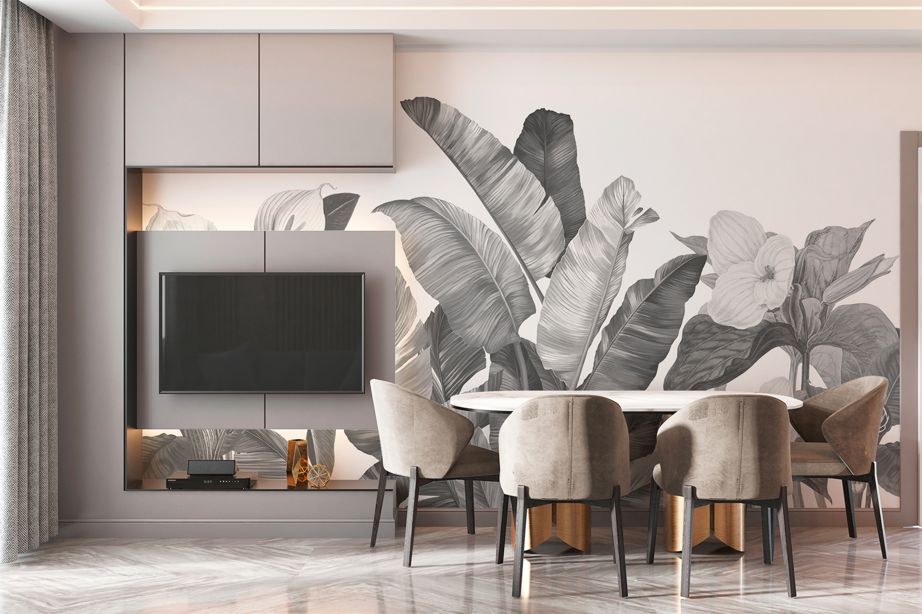 Φανταστείτε να μπαίνετε σε ένα δωμάτιο και ΜΠΑΜ – να βρίσκεστε στον δικό σας τροπικό παράδεισο. Αυτό ακριβώς κάνει αυτή η τοιχογραφία. Το “Μονοχρωματικά τροπικά φύλλα και άνθη” δεν είναι απλώς ένα όνομα, είναι μια ολόκληρη ατμόσφαιρα. Σκεφτείτε το – τολμηρά φύλλα μπανάνας που αναμειγνύονται με εξωτικά λουλούδια, όλα σε μια καταπραϋντική κλίμακα του γκρι που με κάποιο τρόπο το κάνει να αισθάνεται ήρεμο και αριστοκρατικό. Ιδανικό για όποιον αγαπά τη ζούγκλα αλλά μπορεί να κάνει χωρίς τα κουνούπια, σωστά;