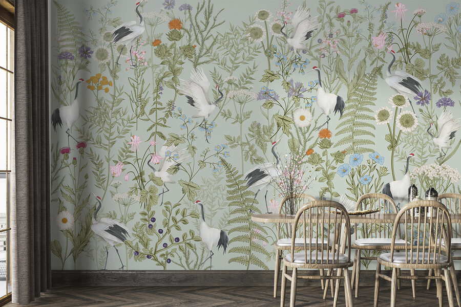 Είτε είστε λάτρης της φύσης είτε απλά κάποιος που απολαμβάνει λίγη ιδιοτροπία, αυτή η τοιχογραφία σας καλύπτει. Το μείγμα πρασίνου και πολύχρωμων λουλουδιών δημιουργεί μια γαλήνια αίσθηση δάσους – ιδανική για να δημιουργήσετε μια γαλήνια γωνιά όπου μπορείτε να χαλαρώσετε με ένα καλό βιβλίο ή ένα φλιτζάνι τσάι. Επιπλέον, υπάρχει κάτι αβίαστα κομψό με τα λευκά πουλιά ενάντια σε όλο αυτό το πράσινο. Είναι σαν να έχετε ένα μικρό κομμάτι από ένα μαγεμένο δάσος μέσα στο σπίτι σας.