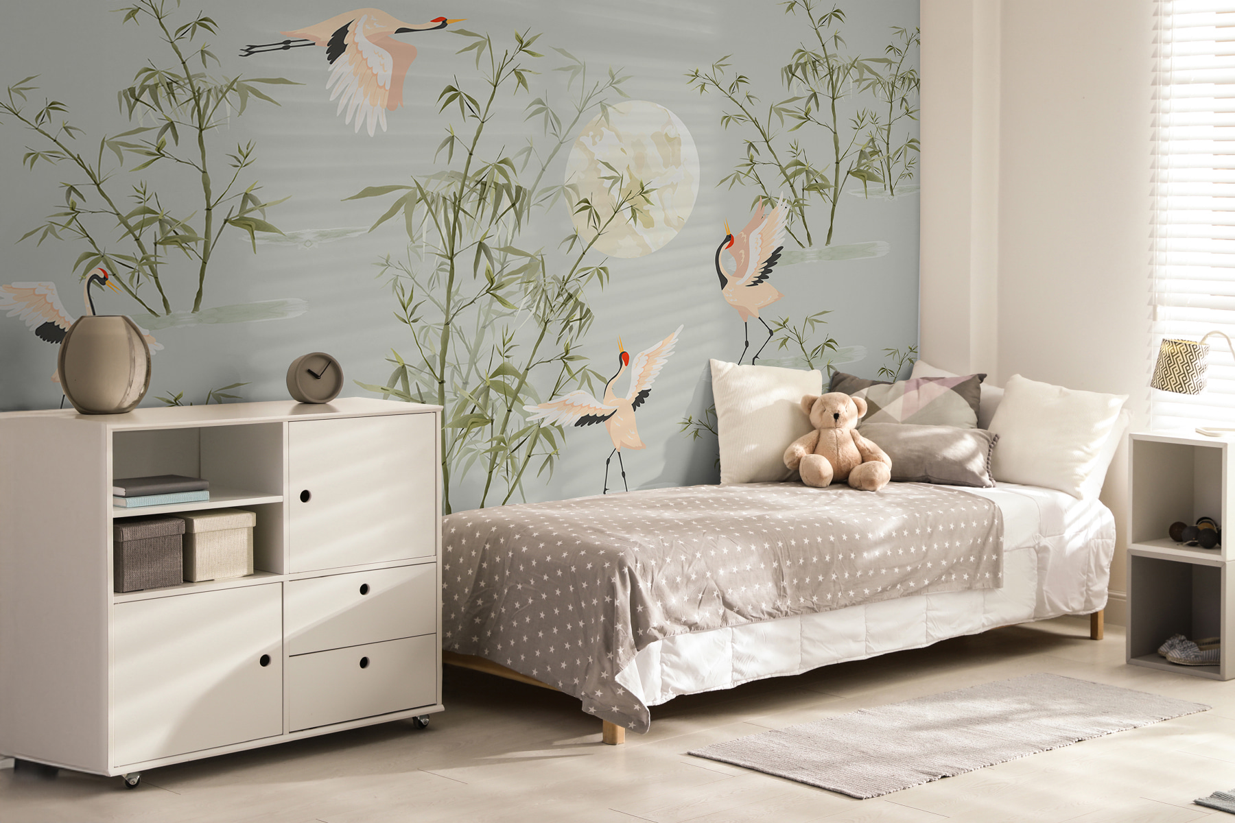 Μεταμορφώστε οποιονδήποτε χώρο σε μια γαλήνια απόδραση με αυτή την απολαυστική τοιχογραφία τοίχου με γερανούς και μπαμπού κάτω από έναν φεγγαρόφωτο ουρανό. Είναι σαν να προσκαλείτε τη φύση μέσα στο σπίτι σας, και ας είμαστε ειλικρινείς, ποιος δεν θα ήθελε μια ειρηνική, φεγγαρόφωτη σκηνή για να κοιτάζει κατά τη διάρκεια αυτών των μακρών ημερών εργασίας από το σπίτι; Φανταστείτε το – να κοιτάτε τους κομψούς γερανούς που πετούν, νιώθοντας μια μικρή ηρεμία να σας κατακλύζει. Είναι αρκετά ευφάνταστο για να προκαλέσει ονειροπολήσεις, αλλά και αρκετά γειωμένο για να ταιριάζει όμορφα σε οποιοδήποτε δωμάτιο. Ανανεώστε τους τοίχους σας – δεν είναι απλώς διακόσμηση, είναι μια εμπειρία που περιμένει να συμβεί!