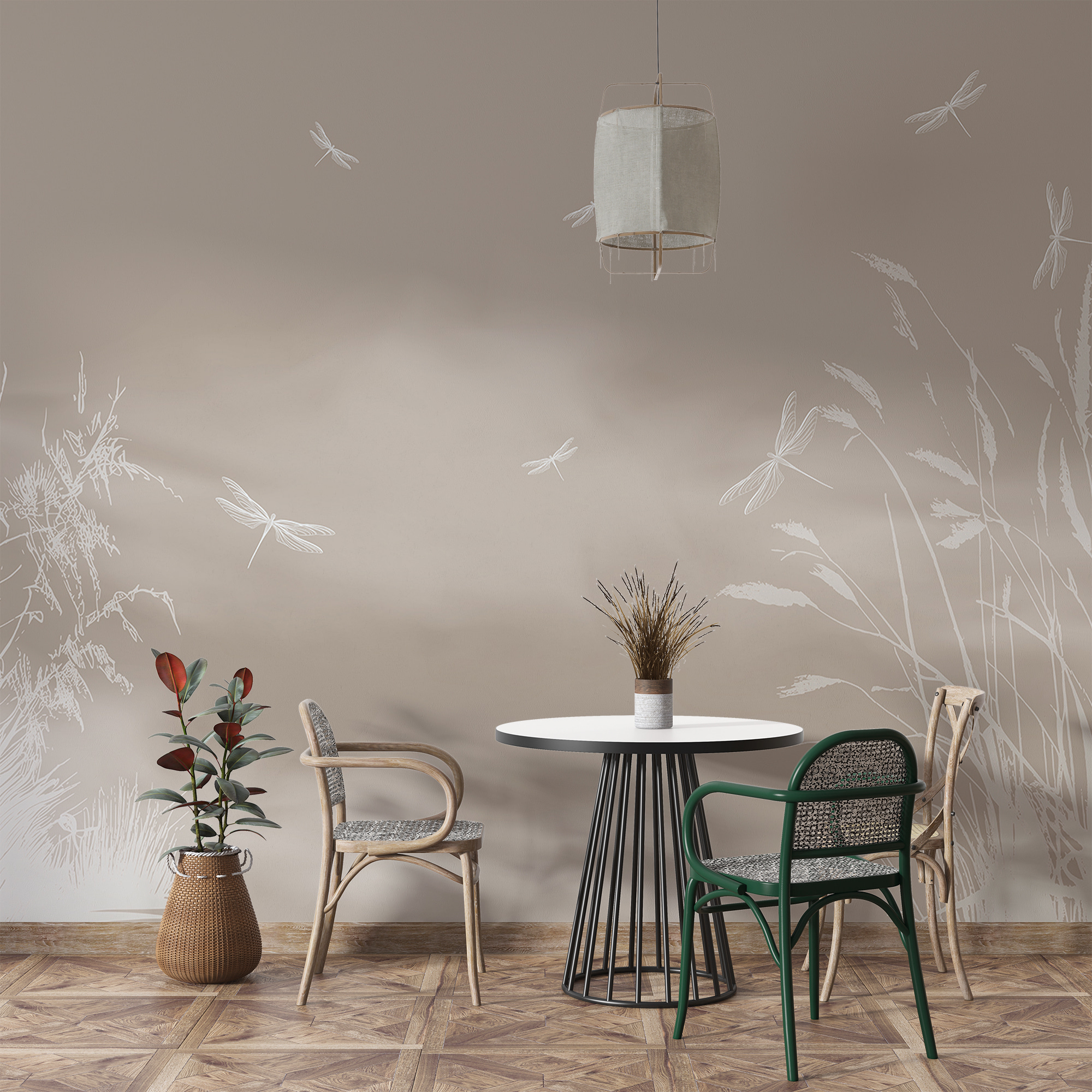 Αυτή η τοιχογραφία δεν είναι απλώς μια διακόσμηση, αλλά έναυσμα για συζήτηση. Οι φίλοι θα μπουν μέσα, θα κάνουν μια διπλή ματιά και θα αναρωτηθούν αν έχετε εγκαταστήσει ένα παράθυρο σε ένα γαλήνιο λιβάδι. Τα διακριτικά χρώματα δημιουργούν μια ζεστή αλλά και ευάερη ατμόσφαιρα, ιδανική για κάθε δωμάτιο που αποζητά μια πινελιά ιδιοτροπίας και φύσης. Επιπλέον, δεν χρειάζεται να έχετε πράσινο αντίχειρα εδώ – μόνο την ειρηνική κομψότητα των λιβελούλων που φτερουγίζουν. Ιδανικό για τους λάτρεις της φύσης ή για οποιονδήποτε χρειάζεται μια μικρή ανάσα φρέσκου αέρα σε εσωτερικούς χώρους.