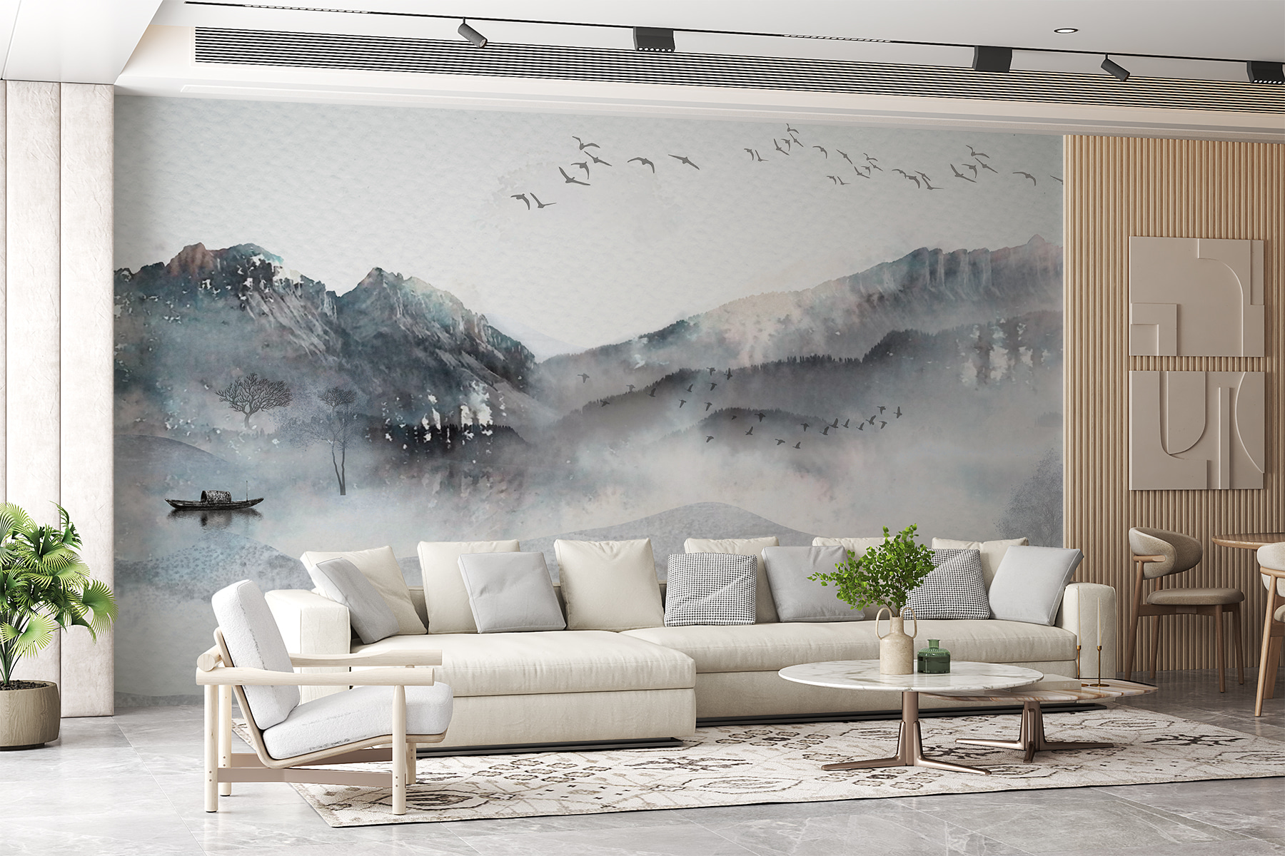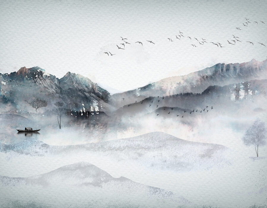 Φανταστείτε να μπαίνετε σε ένα δωμάτιο και να σας υποδέχεται μια γαλήνια ομάδα πουλιών που πετούν σε έναν ονειρικό ουρανό, παρασυρόμενα ψηλά πάνω από ένα ομιχλώδες δασικό τοπίο. Αυτή η τοιχογραφία ακουαρέλας δεν είναι απλώς τέχνη – είναι μια εμπειρία. Η καταπραϋντική ομίχλη, οι απαλοί λόφοι και τα μακρινά βουνά – σαν ένας απαλός ψίθυρος της φύσης. Είναι σχεδόν σαν να μπορείτε να ακούσετε τον ψίθυρο των δέντρων και να νιώσετε τον δροσερό, τραγανό πρωινό αέρα να αγγίζει το δέρμα σας.