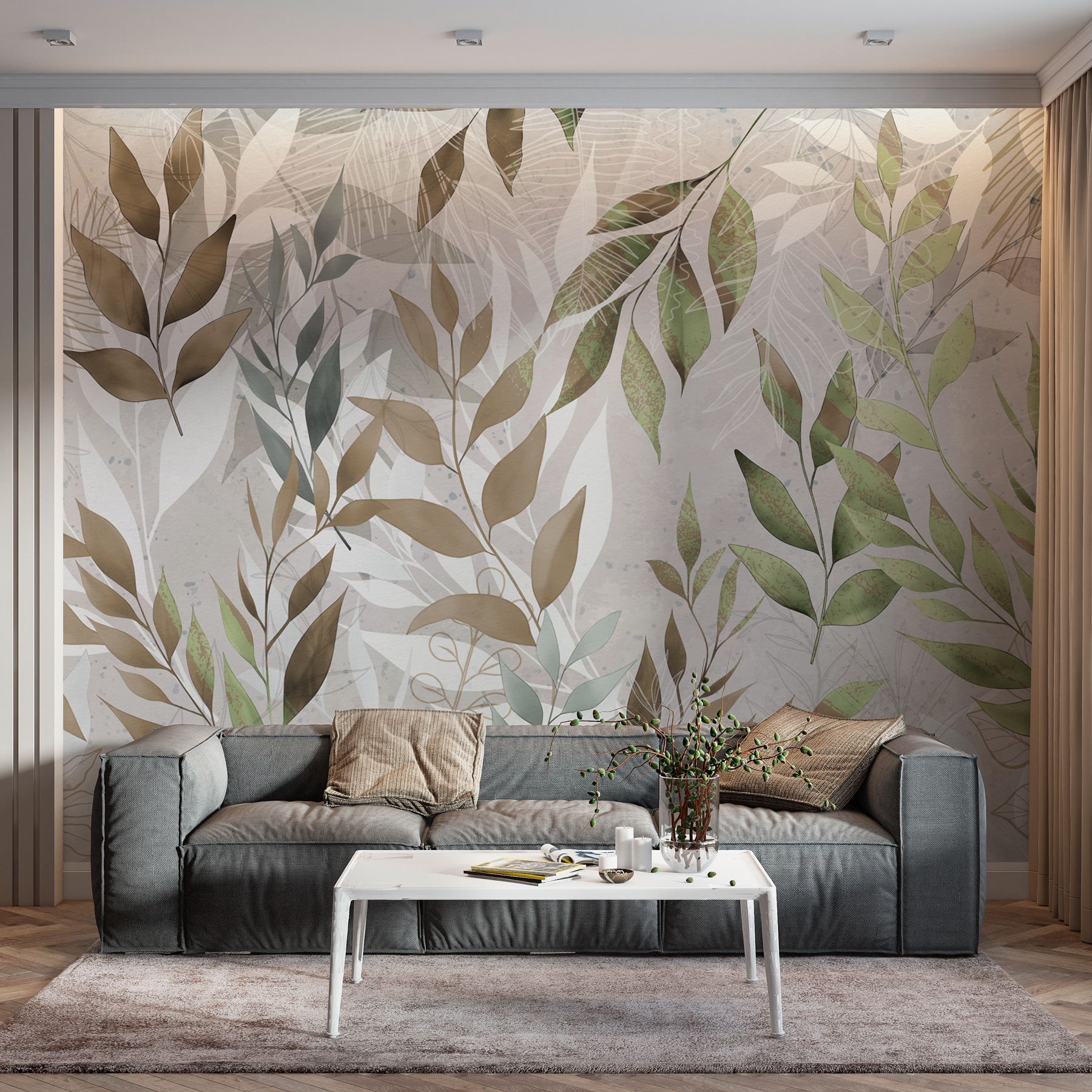 Τα χρώματα είναι απαλά αλλά ζωηρά πράσινα και καφέ χρώματα, που αναμειγνύονται τέλεια για να δώσουν αυτό το αβίαστα δροσερό βλέμμα. Κάθε φορά που το κοιτάζετε, μπορεί να νιώθετε λίγο πιο χαλαροί, σαν να κάνετε μίνι διακοπές. Ιδανικό για όσους αγαπούν την ομορφιά της φύσης αλλά δεν μπορούν να βρίσκονται πάντα έξω. Αυτή η τοιχογραφία δεν διακοσμεί απλώς, δημιουργεί μια εμπειρία – φανταστείτε άνετα πρωινά με καφέ ή βράδια με απαλή μουσική, περιτριγυρισμένα από αυτό το υπέροχο έργο τέχνης με τα φύλλα. Ιδανικό για όνειρα.