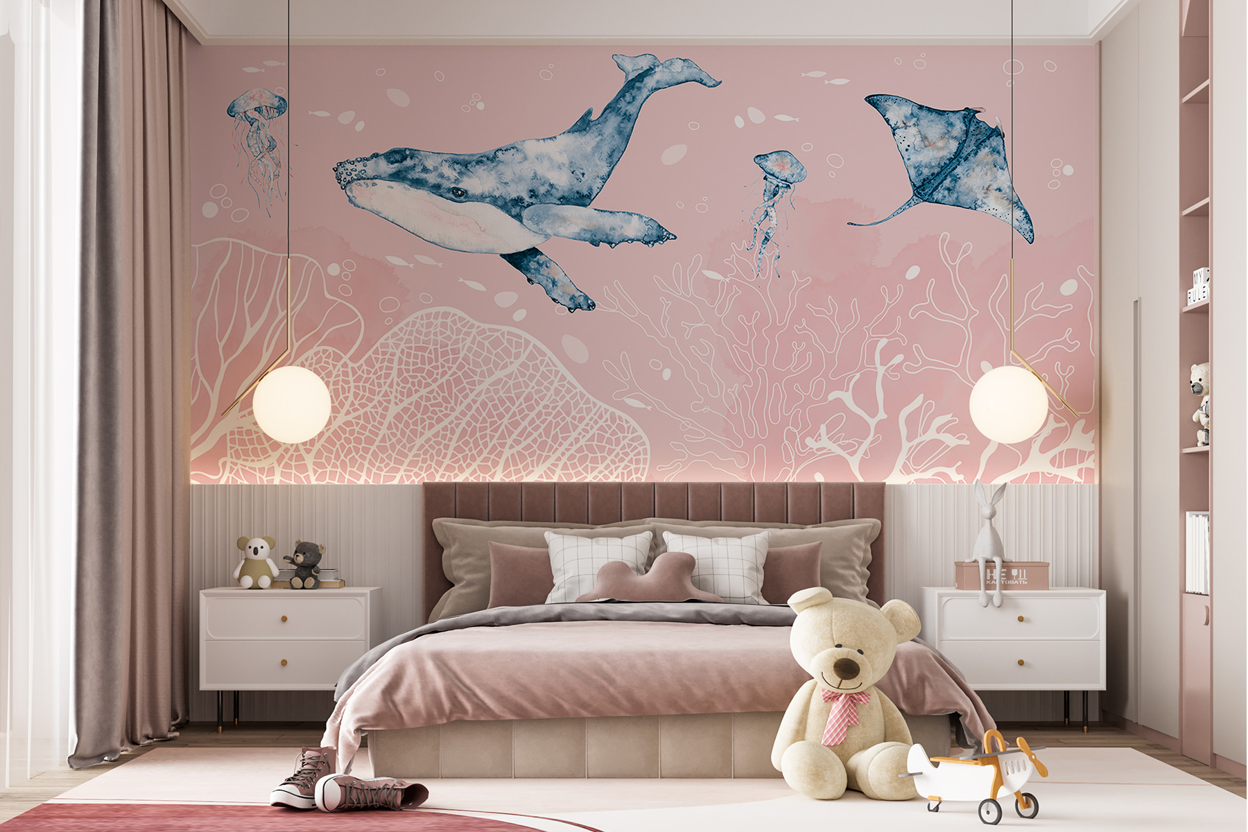 Φανταστείτε να μπαίνετε σε ένα δωμάτιο και να βρίσκεστε χαμένοι σε έναν γαλήνιο υποβρύχιο κόσμο. Η τοιχογραφία “Watercolor of a Whale” είναι σαν να έχετε ένα κομμάτι του ωκεανού στον τοίχο σας. Οι ονειρικές παστέλ αποχρώσεις συνδυάζονται αβίαστα, προσφέροντας μια αίσθηση ηρεμίας και ιδιοτροπίας. Μια κομψή φάλαινα, χαριτωμένες μέδουσες και περίεργα σαλάχια επιπλέουν γύρω σας, κάνοντάς σας να νιώθετε σαν να έχετε βυθιστεί σε μια μαγική θάλασσα.