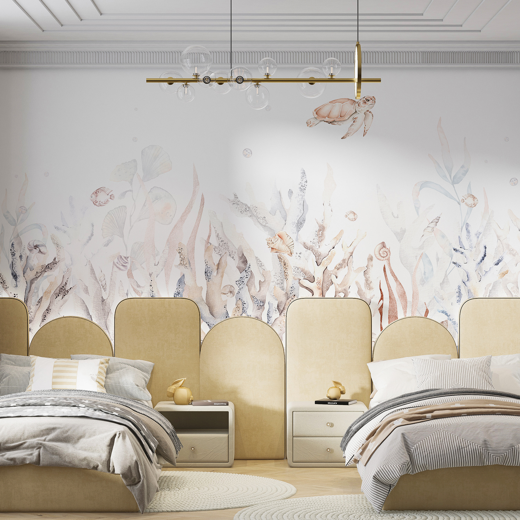 Φανταστείτε την ηρεμία της θαλάσσιας ζωής ακριβώς στο σαλόνι σας! Αυτό το έργο “Ταπετσαρίες Sea life swimming among corals”, είναι σαν να έχετε έναν υποβρύχιο παράδεισο στον τοίχο σας. Τα στροβιλιζόμενα κοράλλια, τα παιχνιδιάρικα ψάρια και οι χαριτωμένες θαλάσσιες χελώνες προσδίδουν μια φρέσκια, γαλήνια ατμόσφαιρα – ιδανική για κάθε δωμάτιο που επιθυμεί μια πινελιά ήρεμης κομψότητας. Θέλω να πω, φανταστείτε το γραφείο ή το παιδικό σας δωμάτιο με αυτή τη γαλήνια πινελιά – είναι σαν μια καθημερινή μίνι-διακοπή χωρίς να βγαίνετε από το σπίτι. Μια χαριτωμένη μικρή χελώνα που επιπλέει, γλιστράει με χάρη, και σίγουρα θα σας χαρίσει ένα χαμόγελο στο πρόσωπό σας κάθε φορά που τη βλέπετε. Η τεχνοτροπία της ακουαρέλας της δίνει μια απαλή, καλλιτεχνική αίσθηση – σχεδόν σαν ονειρεμένος πίνακας ζωγραφικής. Αν η διακόσμηση με θέμα τα ψάρια ή η γαλήνη της θάλασσας είναι το φόρτε σας, αυτή η τοιχογραφία καλύπτει τους τοίχους σας. Βυθιστείτε και προσθέστε μια βουτιά ωκεάνιας ομορφιάς στο χώρο σας!