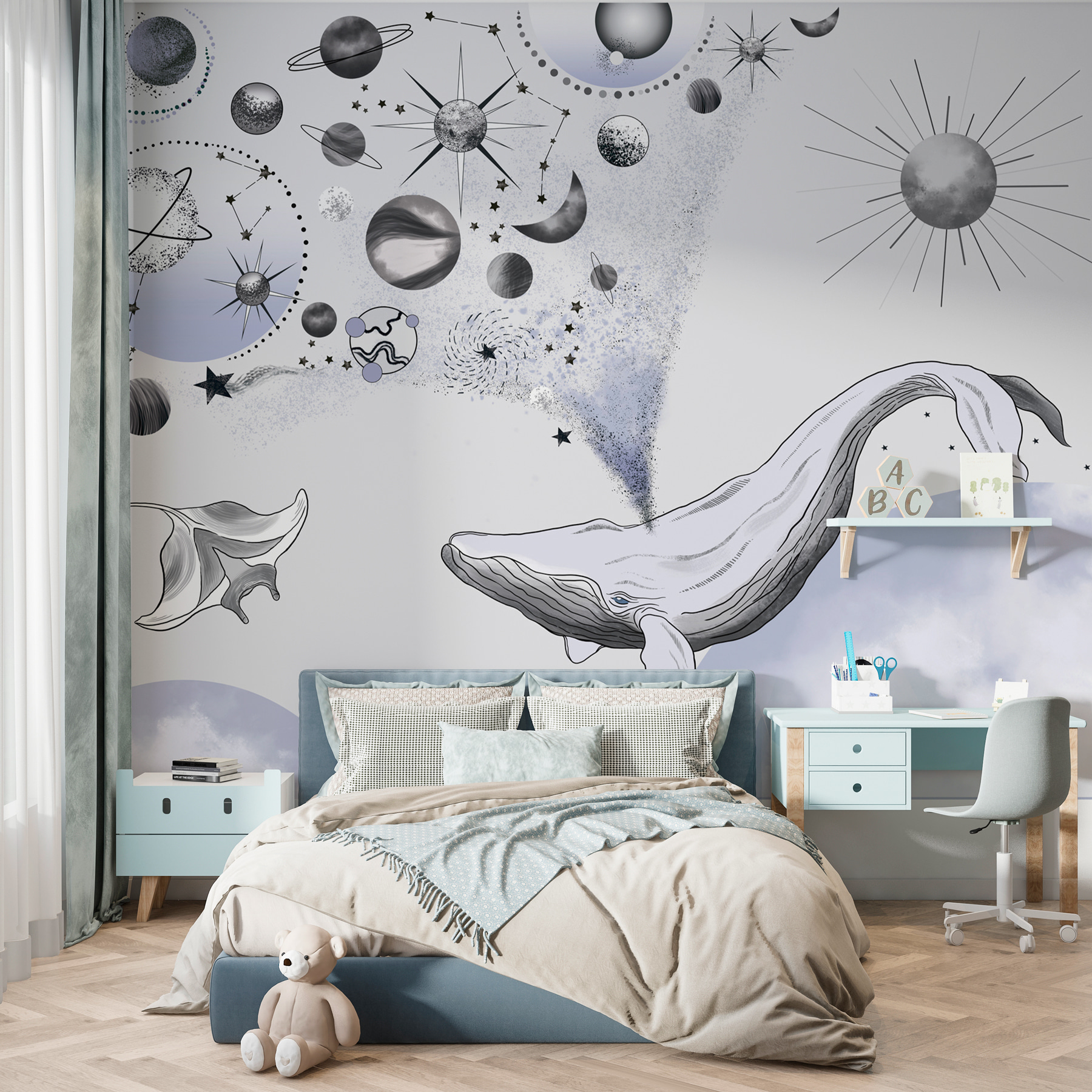 Μεταμορφώστε οποιονδήποτε χώρο με αυτή την τοιχογραφία που μοιάζει με βόλτα σε μια ονειρική χώρα των θαυμάτων. Φανταστείτε μια ευγενική φάλαινα να γλιστρά μέσα στο σύμπαν, περιτριγυρισμένη από στροβίλους αστρικής μαγείας και παιχνιδιάρικους πλανήτες. Η ασπρόμαυρη ατμόσφαιρα της δίνει μια μοντέρνα πινελιά που ταιριάζει οπουδήποτε, από ένα παιδικό δωμάτιο μέχρι μια ζεστή γωνιά ανάγνωσης. Είναι σαν έναυσμα για συζήτηση, προκαλώντας ονειροπολήσεις από τα βάθη του ωκεανού και τον έναστρο ουρανό. Φανταστείτε να κουλουριαστείτε με ένα καλό βιβλίο, να ρίξετε μια ματιά σε αυτή την τοιχογραφία και να νιώσετε αυτή τη σπίθα της φαντασίας. Ιδανικό για όσους αγαπούν μια δόση ιδιοτροπίας στη διακόσμησή τους!