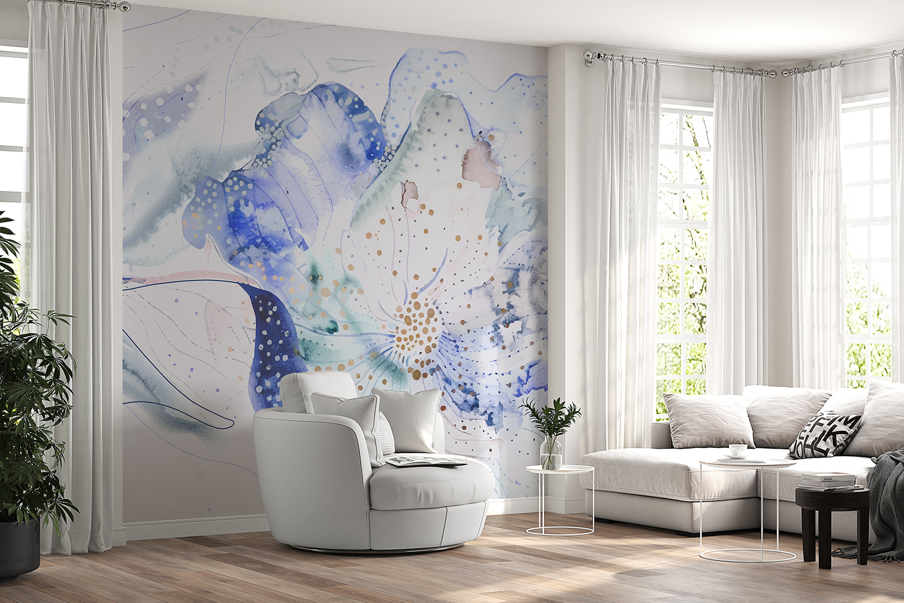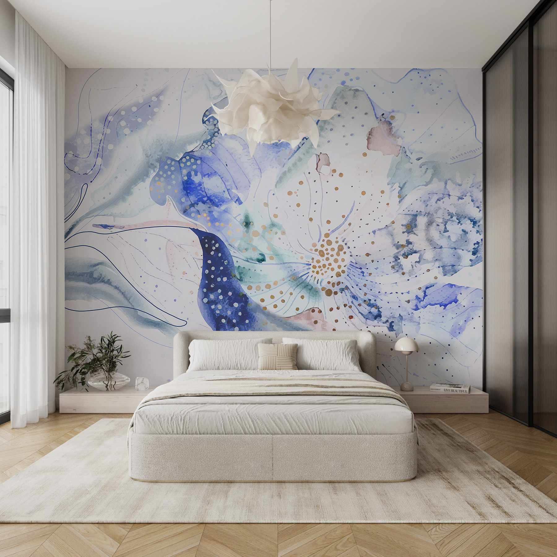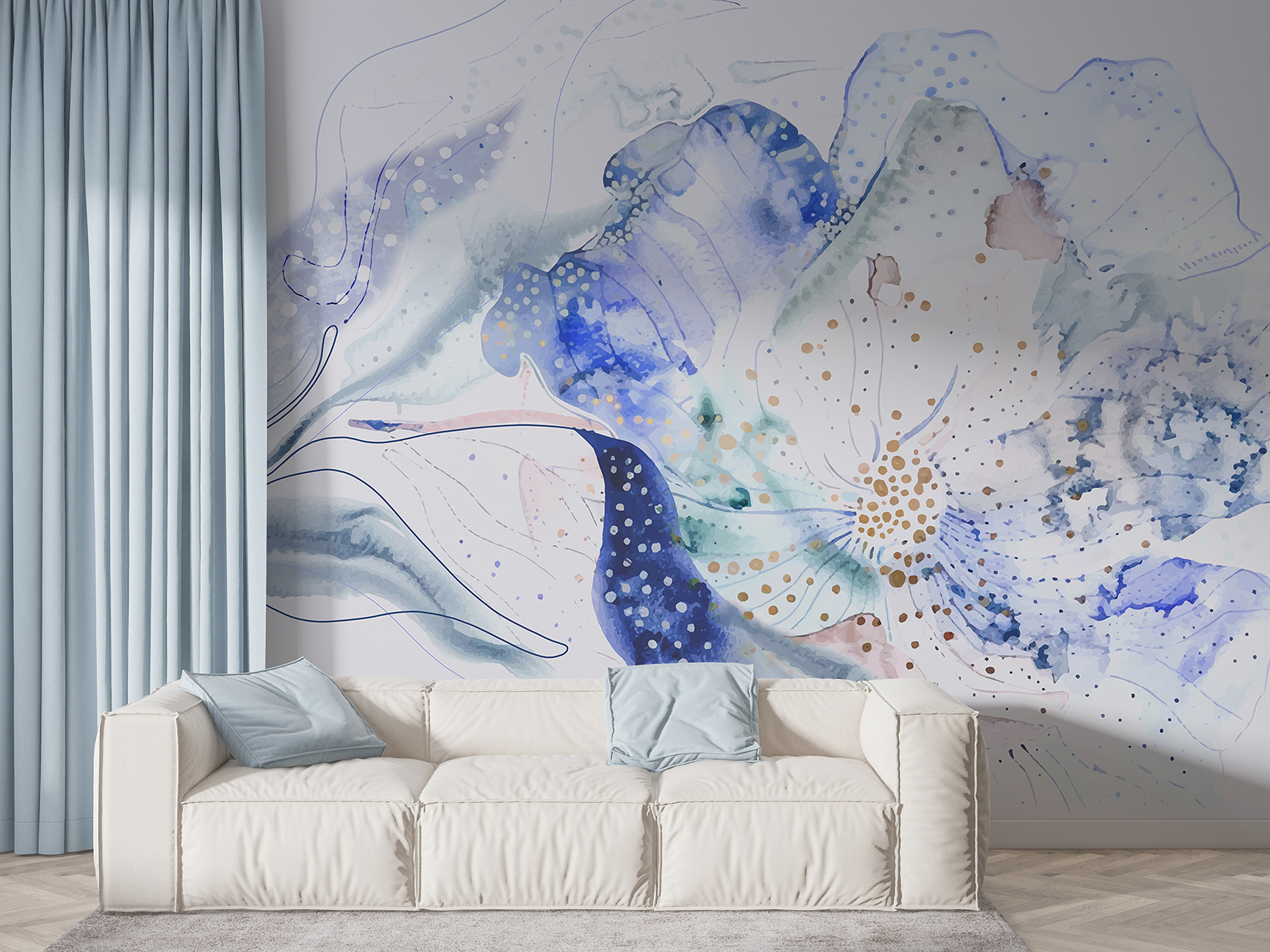 Μεταμορφώστε οποιονδήποτε χώρο με αυτή την εκπληκτική τοιχογραφία που μοιάζει σαν να μπαίνετε σε έναν γαλήνιο κήπο γεμάτο ντελικάτα άνθη. Οι απαλές νερομπογιές του μπλε προσδίδουν μια ήρεμη γαλήνη που είναι ιδανική για να φωτίσει ένα δωμάτιο ή να δημιουργήσει μια ζεστή γωνιά. Φανταστείτε να κουλουριαστείτε με ένα καλό βιβλίο, με τις απαλές λουλουδένιες δονήσεις να σας τυλίγουν σαν μια ζεστή αγκαλιά. Είναι σαν να φέρνετε μια ανάσα φρέσκου αέρα στο σπίτι, χωρίς τις αλλεργίες. Οι απαλές δίνες και οι παιχνιδιάρικες κουκκίδες αυτής της τοιχογραφίας χορεύουν στον τοίχο, προσκαλώντας την αίσθηση του θαύματος και του προβληματισμού. Μια μικρή βουτιά στη φύση – σε ποιον δεν θα άρεσε αυτό;