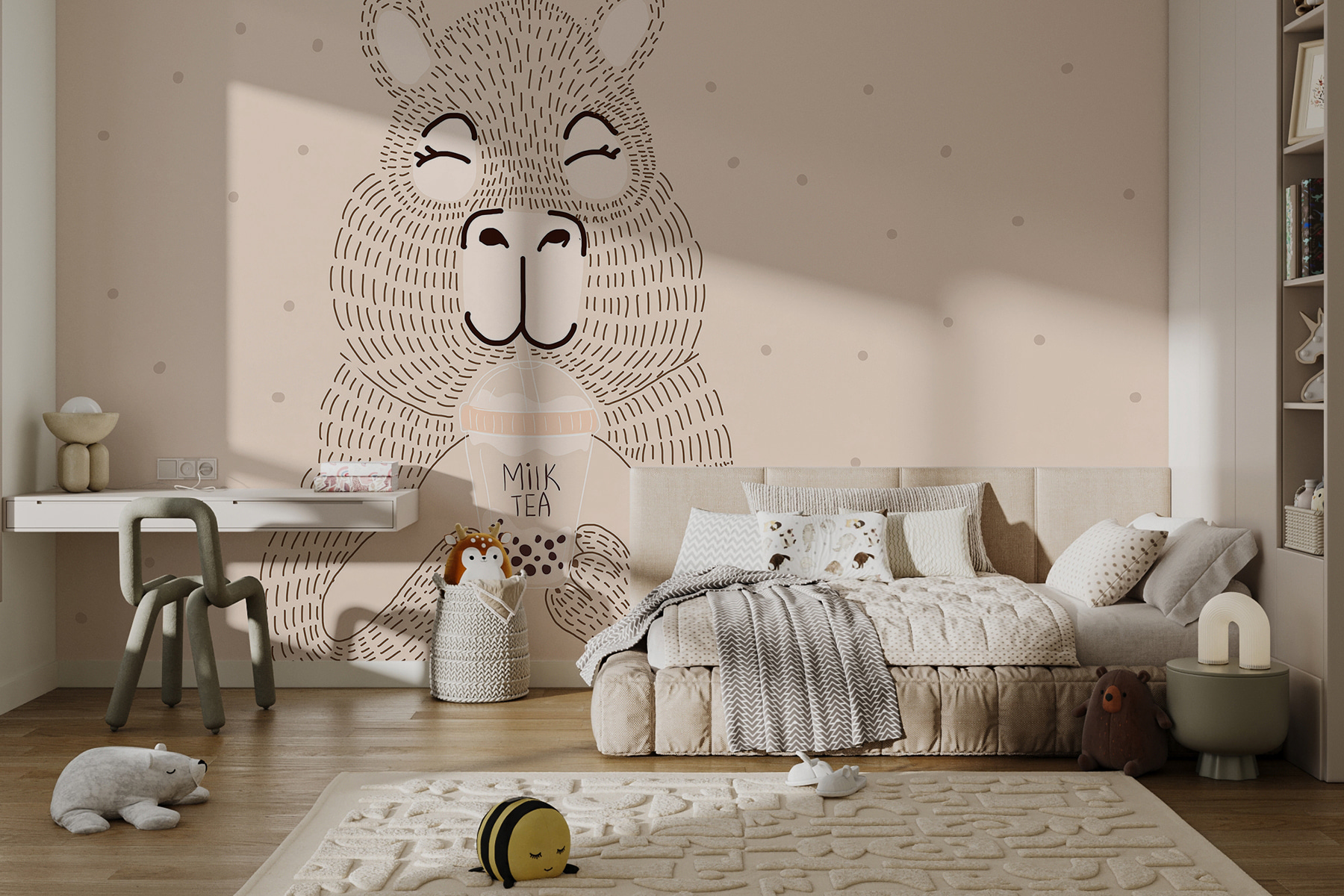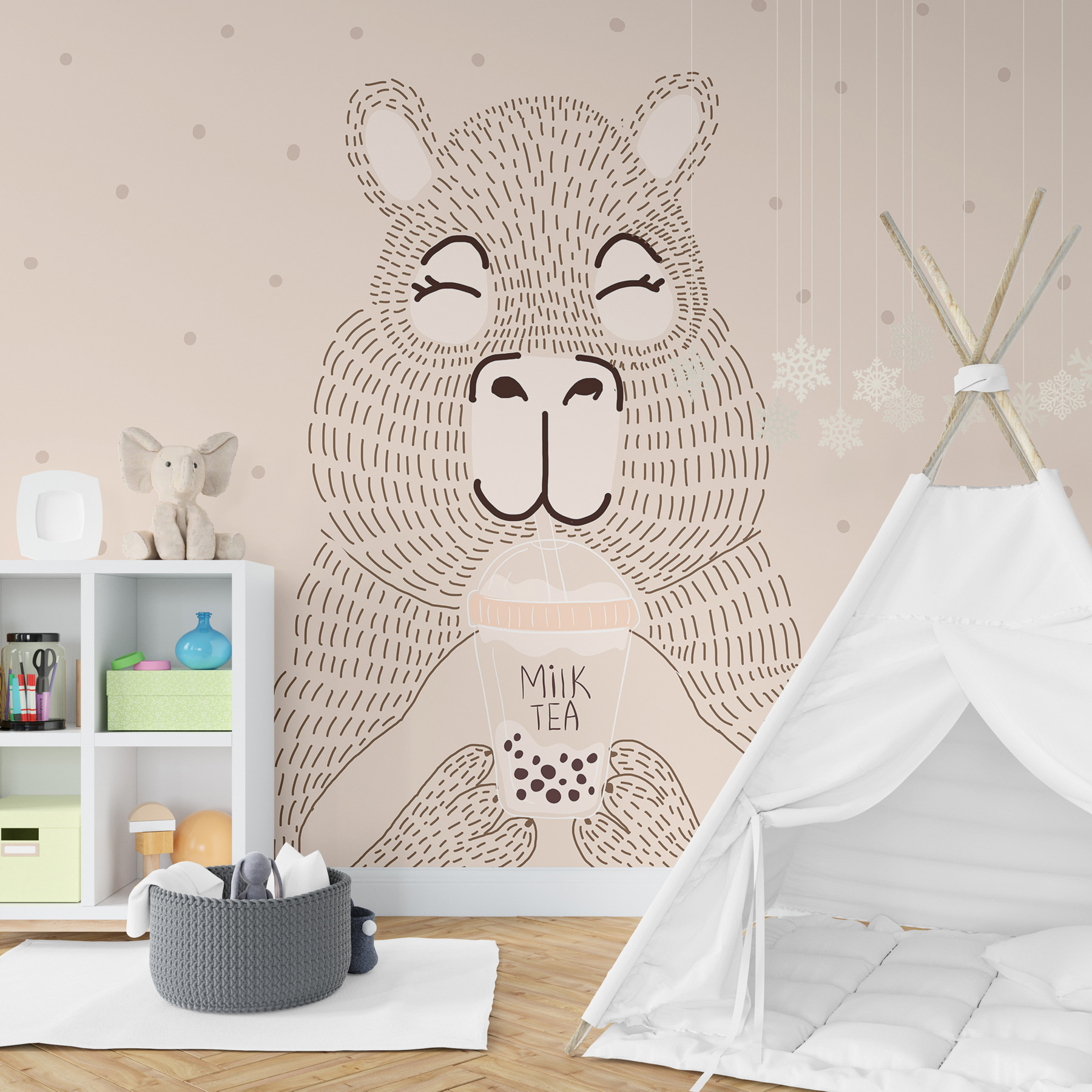 Μεταμορφώστε το χώρο σας με αυτή τη γοητευτική τοιχογραφία μιας αρκούδας που απολαμβάνει ευτυχισμένη το τσάι φούσκα – είναι σαν να προσκαλείτε μια παράξενη ιστορία στον τοίχο σας. Ιδανική για να προσθέσετε μια πινελιά παιχνιδιάρικης θαλπωρής σε οποιοδήποτε δωμάτιο, αυτή η τοιχογραφία συνδυάζει το χαριτωμένο και το ιδιόρρυθμο με τον καλύτερο τρόπο. Φανταστείτε να ξυπνάτε μπροστά σε αυτή την χαρούμενη αρκούδα που σας προκαλεί χαμόγελο πιο γρήγορα και από τον πρωινό σας καφέ. Οι φίλοι και η οικογένεια θα λατρέψουν την απλή γοητεία του. Δεν είναι απλώς διακόσμηση, είναι μια καθημερινή υπενθύμιση για να απολαμβάνετε τις απλές χαρές της ζωής, μια φούσκα τη φορά.