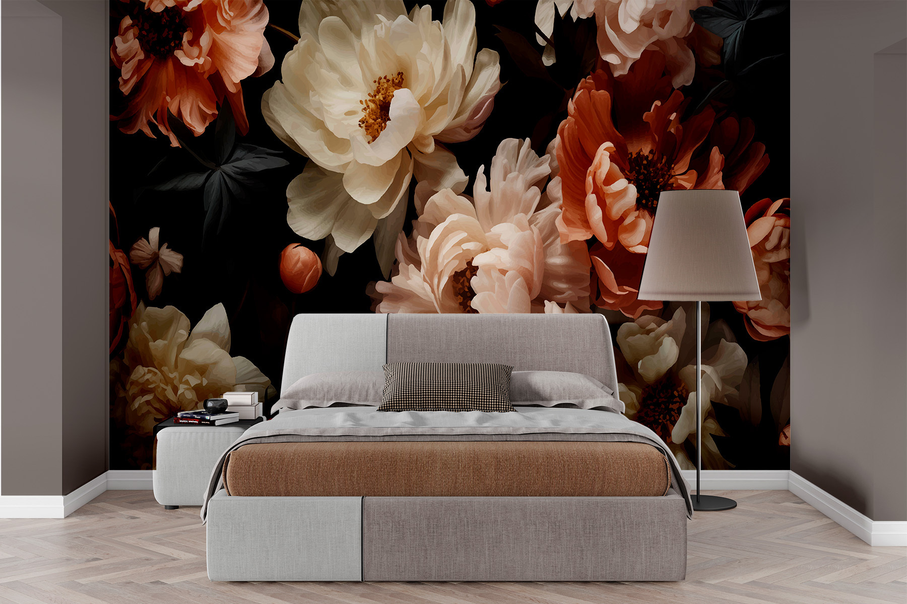 Φανταστείτε να μπαίνετε σε ένα δωμάτιο και να σας υποδέχεται ο κομψός χορός των λουλουδιών σε ένα πλούσιο, σκούρο φόντο. Αυτή η τοιχογραφία φέρνει τη μαγεία ενός μεταμεσονύκτιου κήπου σε εσωτερικούς χώρους, όπου οι παιώνιες και άλλα λουλούδια λικνίζονται διακριτικά, σαν να τα πιάνει ένα απαλό αεράκι. Είναι ένας ψίθυρος του δράματος της φύσης, ιδανικός για τη δημιουργία μιας ζεστής γωνιάς ή τη μετατροπή ενός βαρετού τοίχου σε statement κομμάτι. Οι βαθιές αντιθέσεις δίνουν μια αίσθηση άνεσης και ίντριγκας, σαν να ανακαλύπτεις έναν μυστικό κήπο στο λυκόφως, πυροδοτώντας μια αίσθηση περιπέτειας και γαλήνης ταυτόχρονα.