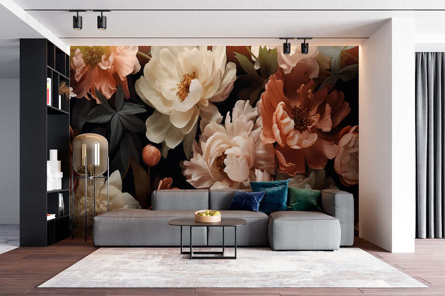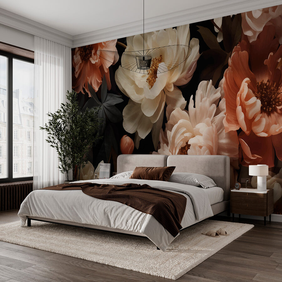 Φανταστείτε να μπαίνετε σε ένα δωμάτιο και να σας υποδέχεται ο κομψός χορός των λουλουδιών σε ένα πλούσιο, σκούρο φόντο. Αυτή η τοιχογραφία φέρνει τη μαγεία ενός μεταμεσονύκτιου κήπου σε εσωτερικούς χώρους, όπου οι παιώνιες και άλλα λουλούδια λικνίζονται διακριτικά, σαν να τα πιάνει ένα απαλό αεράκι. Είναι ένας ψίθυρος του δράματος της φύσης, ιδανικός για τη δημιουργία μιας ζεστής γωνιάς ή τη μετατροπή ενός βαρετού τοίχου σε statement κομμάτι. Οι βαθιές αντιθέσεις δίνουν μια αίσθηση άνεσης και ίντριγκας, σαν να ανακαλύπτεις έναν μυστικό κήπο στο λυκόφως, πυροδοτώντας μια αίσθηση περιπέτειας και γαλήνης ταυτόχρονα.