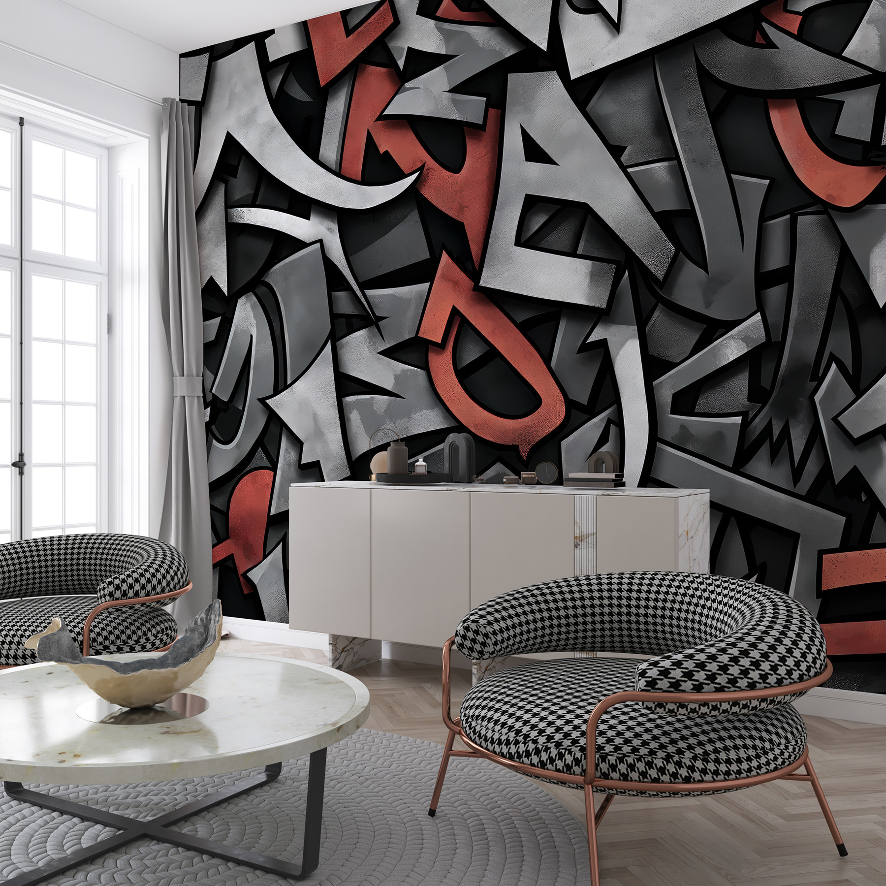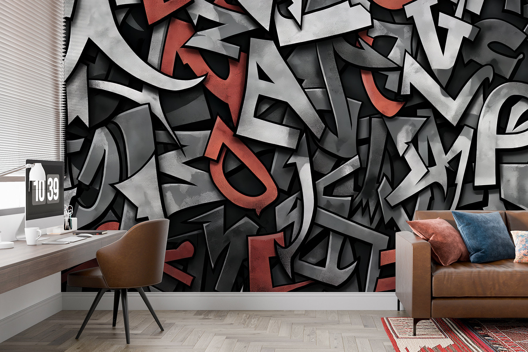 Φανταστείτε να μπαίνετε σε ένα δωμάτιο και να σας χτυπάει ένα κύμα δημιουργικότητας – αυτό θα έχετε με αυτή την τοιχογραφία “Κόκκινο και μαύρο λογότυπο”. Είναι σαν η μοντέρνα τέχνη να εξερράγη στον τοίχο σας, με τολμηρά κόκκινα και βαθιά μαύρα να χορεύουν σε μια θάλασσα από σχήματα και ρυθμούς. Ιδανική για κάποιον που αγαπάει λίγο την αιχμή στη διακόσμησή του. Φανταστείτε να φιλοξενείτε φίλους και να βλέπετε τα μάτια τους να λάμπουν από θαυμασμό (και ίσως και λίγο φθόνο) όταν βλέπουν αυτό το τολμηρό κομμάτι δήλωσης. Δεν είναι απλώς ένα διακοσμητικό τοίχου, είναι ένας άμεσος συνομιλητής. Το πιο ωραίο πράγμα; Ταιριάζει σχεδόν σε κάθε περιβάλλον: σύγχρονα σαλόνια, μοντέρνα γραφεία στο σπίτι ή ακόμη και σε μια κομψή γωνιά καφετέριας. Επιπλέον, ποιος δεν θα ήθελε να ξυπνάει κάθε μέρα με μια βουτιά καλλιτεχνικής έμπνευσης; Αυτή η τοιχογραφία μετατρέπει τους συνηθισμένους τοίχους σε έναν καμβά καθαρής φαντασίας και στυλ. Μπουμ – το δωμάτιο μεταμορφώνεται!