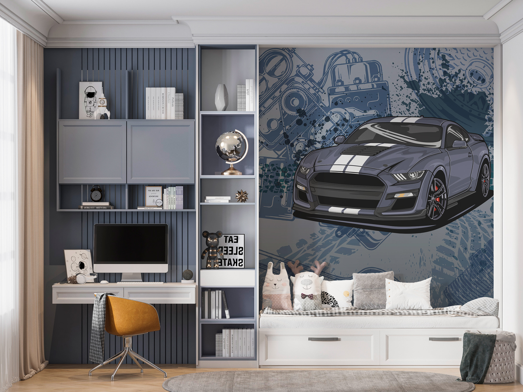Αναζωογονήστε την ενέργεια σε κάθε δωμάτιο με αυτή τη ζωντανή τοιχογραφία τοίχου με ένα κομψό αυτοκίνητο, ένα κλειδί και τροχούς που παίζουν. Είναι σαν να έχετε μια μικρή αυτοκινητική περιπέτεια στον τοίχο σας. Μπορείτε να πιστέψετε πώς ένα απλό σκηνικό μπορεί να μεταμορφώσει την ατμόσφαιρα; Φανταστείτε να αράζετε σε μια ανδρική σπηλιά με θέμα το γκαράζ ή σε ένα παιδικό υπνοδωμάτιο γεμάτο με όνειρα για αγώνες. Αυτή η τοιχογραφία όχι μόνο προσδίδει προσωπικότητα αλλά και χαρά, όπως η μυρωδιά του φρεσκοκομμένου γρασιδιού ή η πρώτη γουλιά καφέ ένα τραγανό πρωινό. Για τους λάτρεις των αυτοκινήτων και τους ονειροπόλους, αυτό δεν είναι απλώς διακόσμηση, είναι μια πύλη σε έναν κόσμο ταχύτητας και δημιουργικότητας.